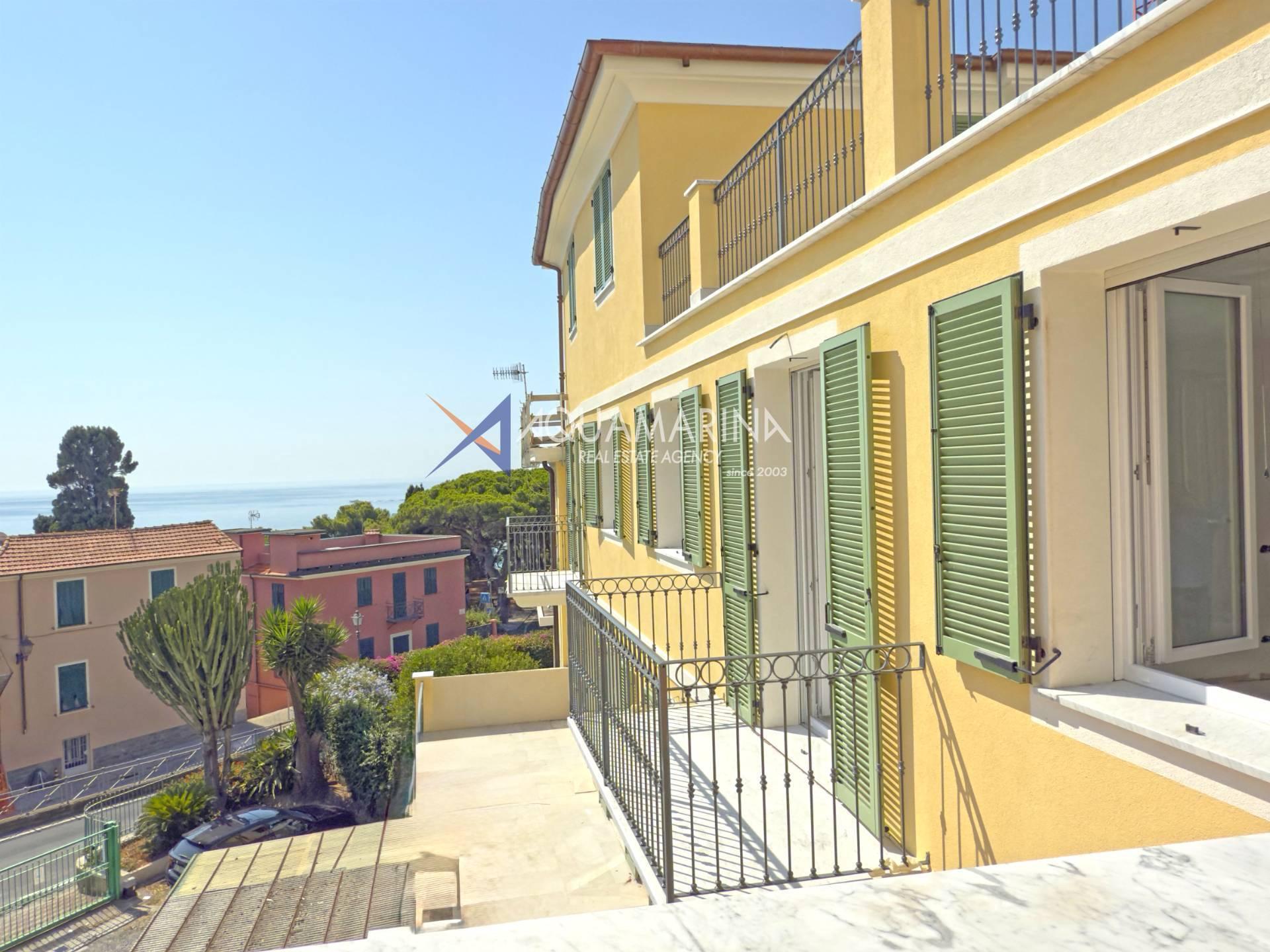L'appartamento è composto da ingresso, soggiorno con cucina a vista, due camere da letto e due bagni, bellissimo spazio esterno per godere la vista panoramica su Bordighera Alta.