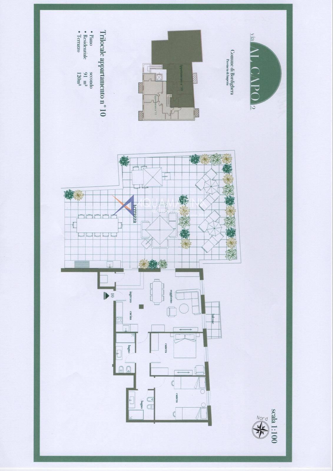Bellissimo appartamento all'ingresso del borgo storico, nel palazzo esclusivo di nuova costruzione denominato "Via al Capo", a Bordighera Alta, si vende ampio trilocale di 91 mq. al piano secondo, con 120 mq. dell'area esterna.
