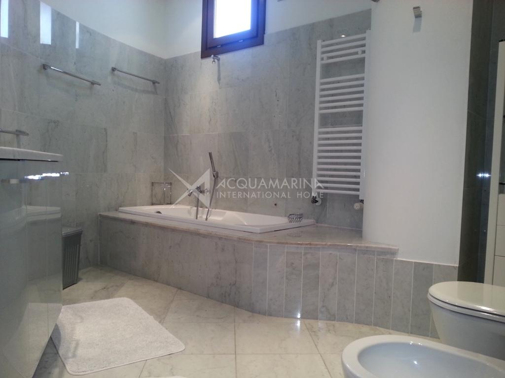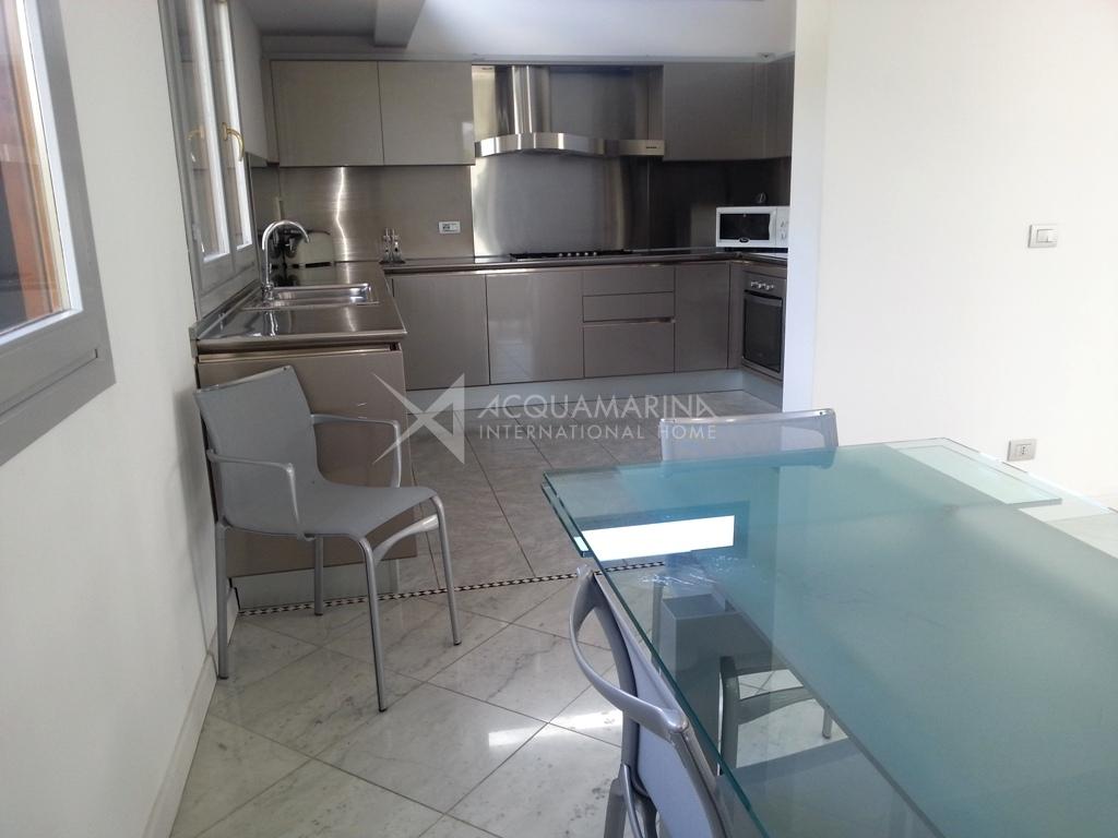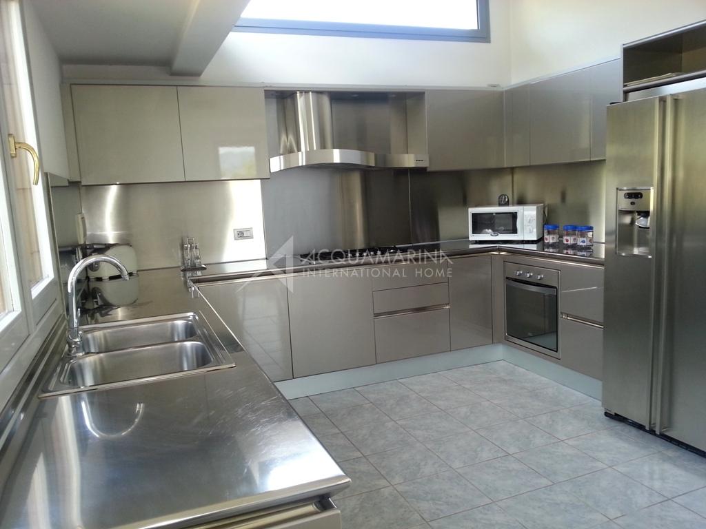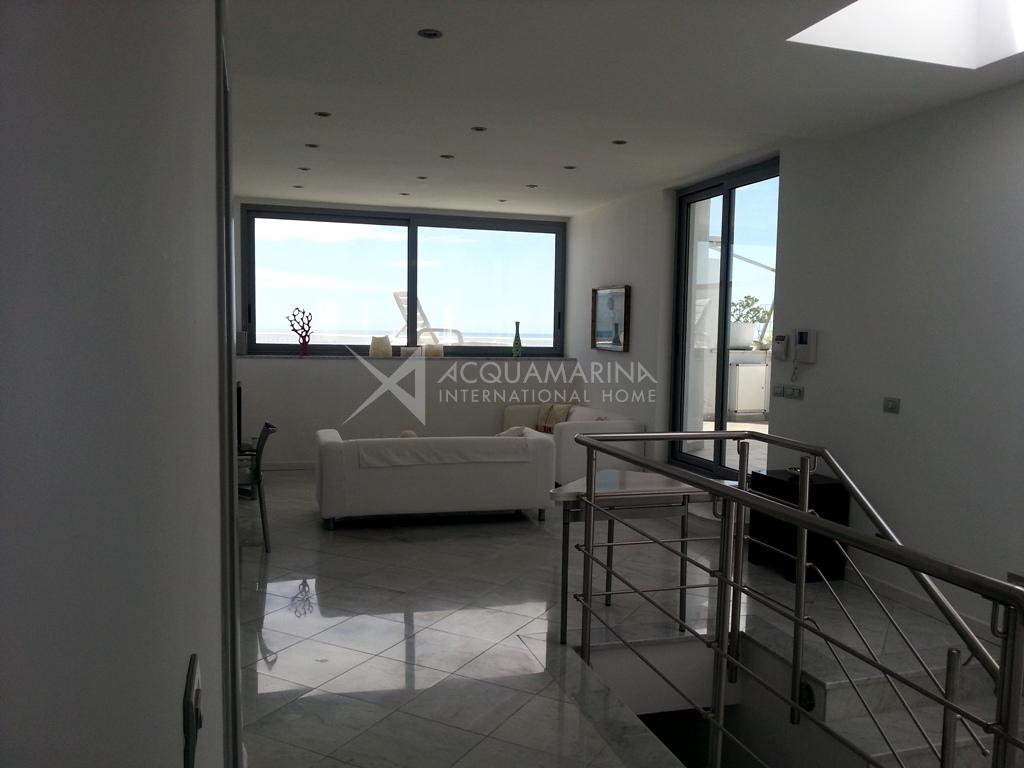 L'appartamento è disposto su due livelli: al piano d'arrivo si trova la zona notte suddivisa in due camere da letto ognuna con bagno privato e zona armadi una delle quali con affaccio su un ampio terrazzo panoramico. La zona giorno al piano superiore è suddivisa in zona relax, zona pranzo, cucina a vista, bagno di servizio e lavanderia. Da qui si accede al terrazzo con splendida vista mare con piccola piscina privata. Completa la proprietà un box doppio e una cantina.