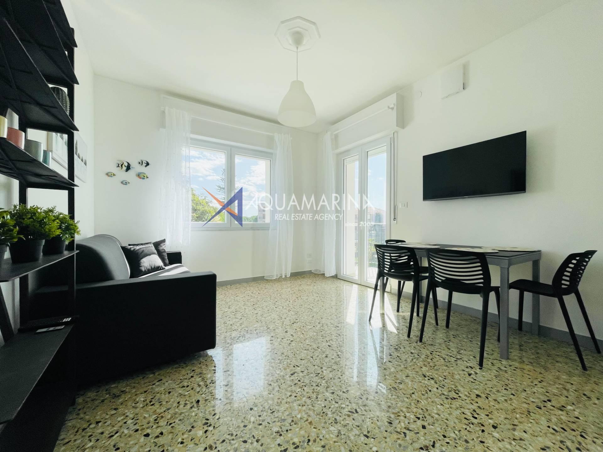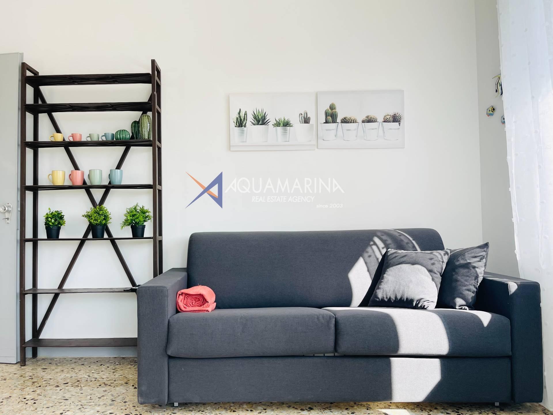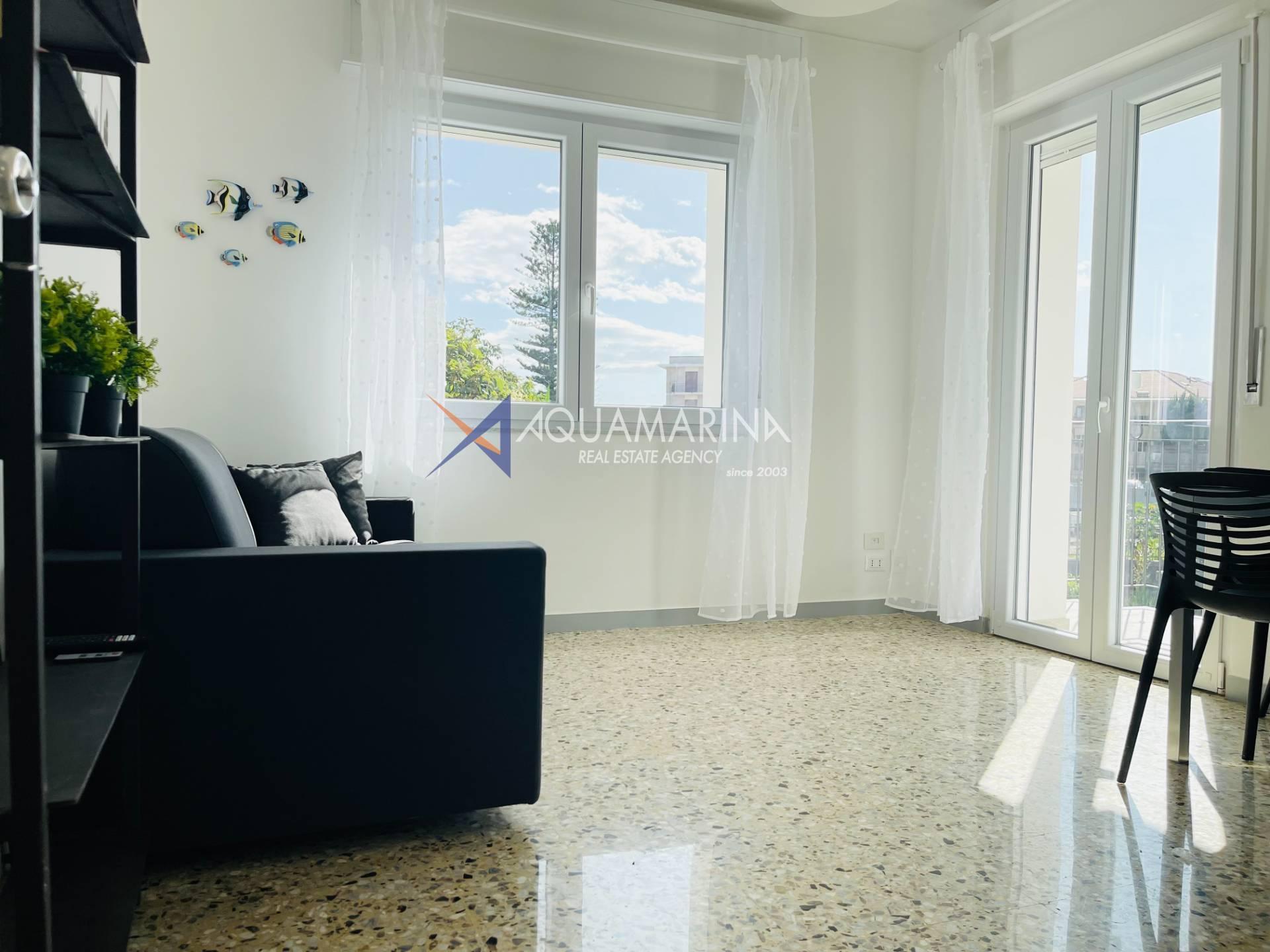 A pochi passi dal mare, in zona pianeggiante e verde, in prossimità di tutti i servizi e le comodità della vita quotidiana proponiamo in affitto appartamento di 49 mq circa composto da: ingresso, soggiorno con angolo cottura dotato di divano letto per 1-2 persone, camera da letto matrimoniale con cabina armadio, bagno con doccia e terrazzo.