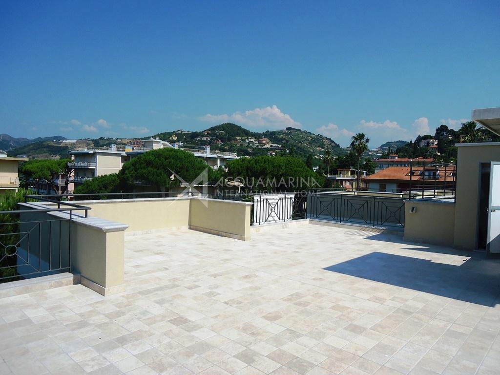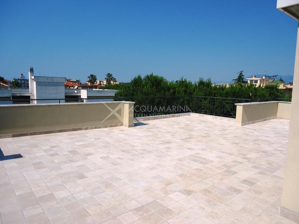 A soli 300 metri dal mare, attico di 100mq con ulteriori 112mq di terrazzo al quale si accede tramite ascensore collegato con l'appartamento e fornito di cucina estiva e attacchi per doccia. Internamente l'attico è composto da: ingresso, soggiorno, cucina abitabile, 2 camere da letto (una con bagno en suite), bagno e zona lavanderia. Cantina e possibilità di acquisto posto auto o garage.