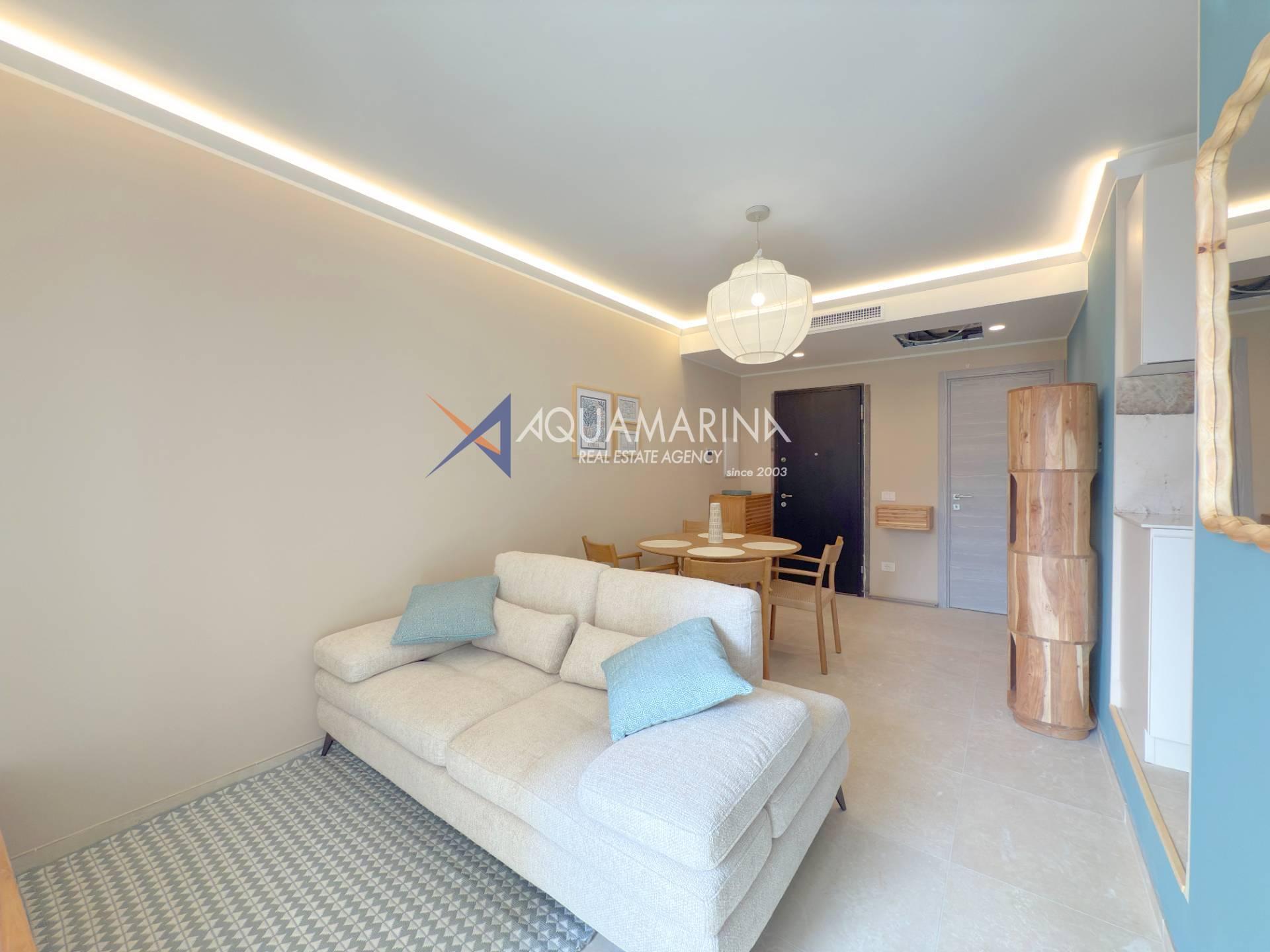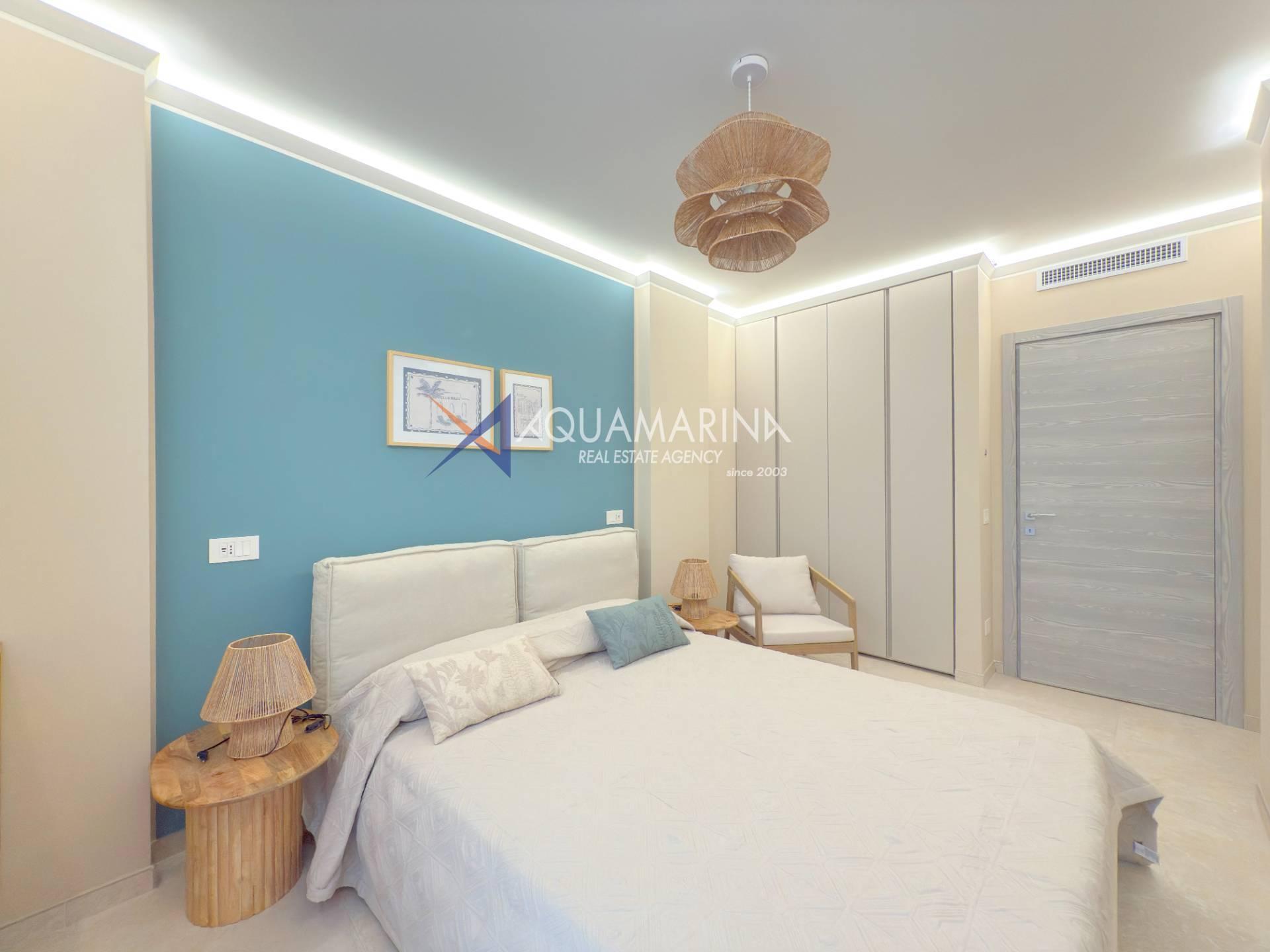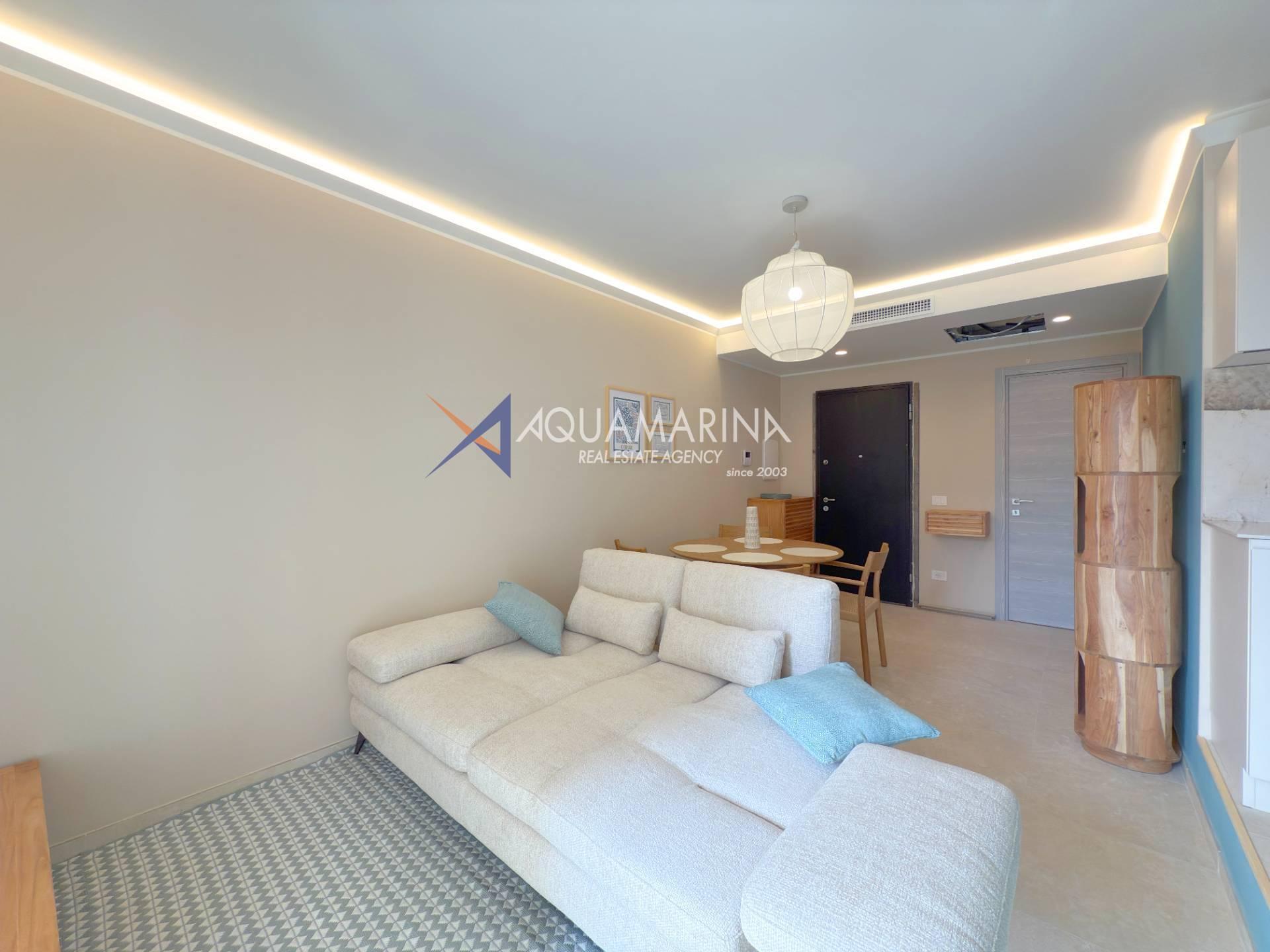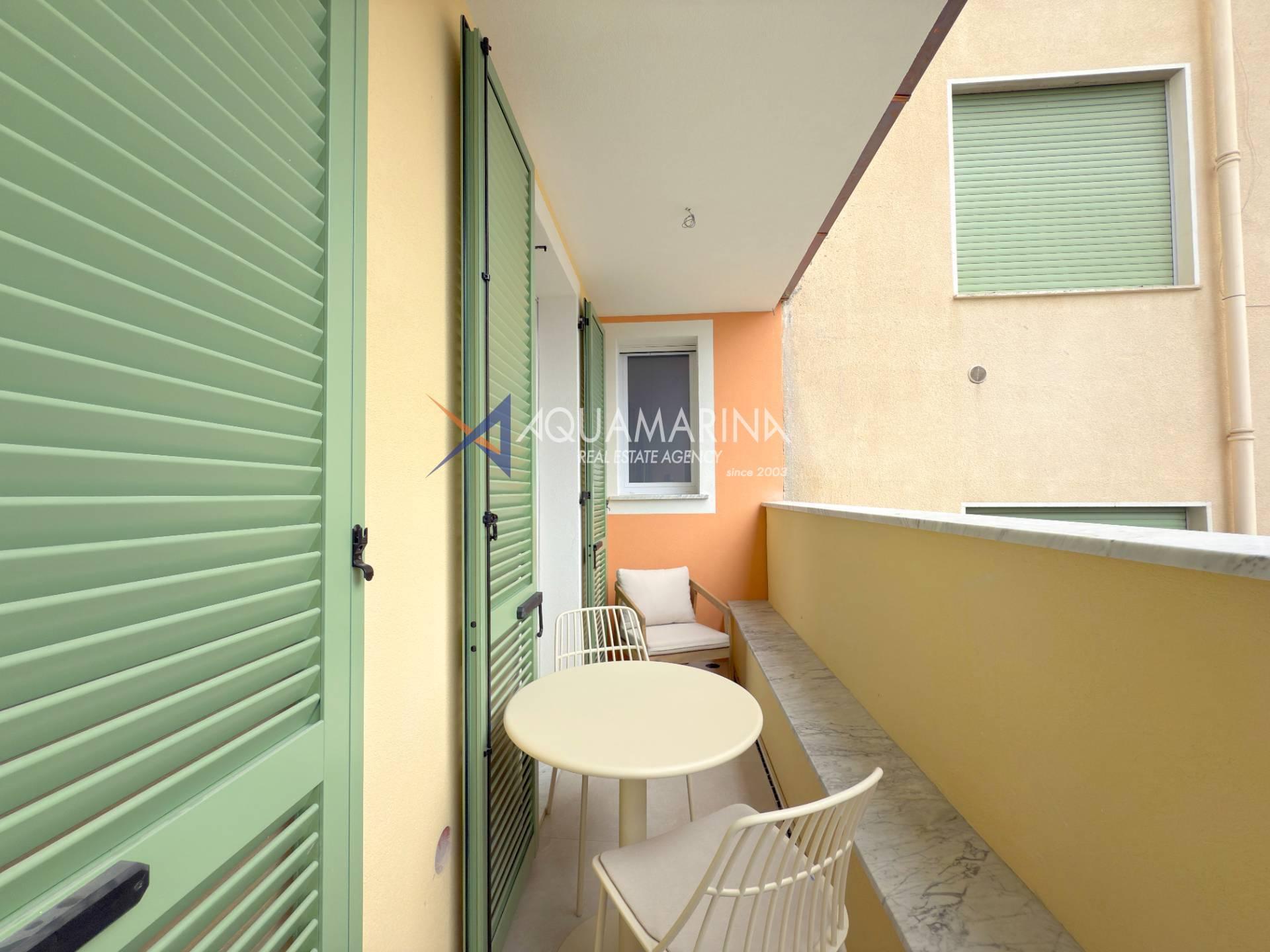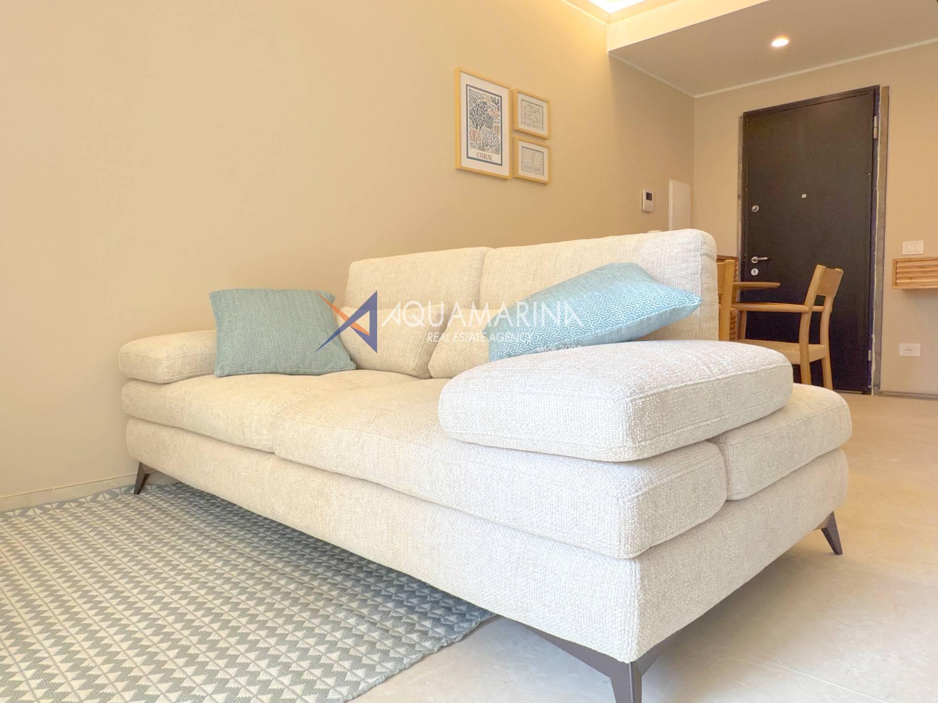 L'appartamento è composto da zona giorno con cucina a vista, disimpegno, una camere da letto, bagno e balcone per rilassarsi all'aria aperta, parziale vista mare.