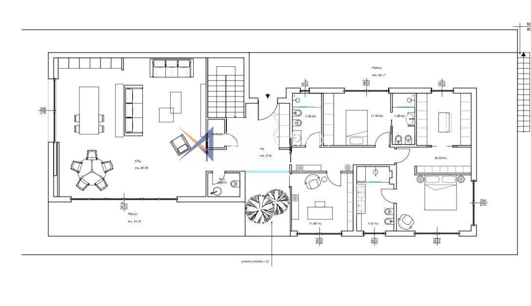Open space soggiorno con cucina, bagno per gli ospiti, 2 camere da letto, 2 bagni, studio (o camera da letto aggiuntiva), grande cabina armadio.