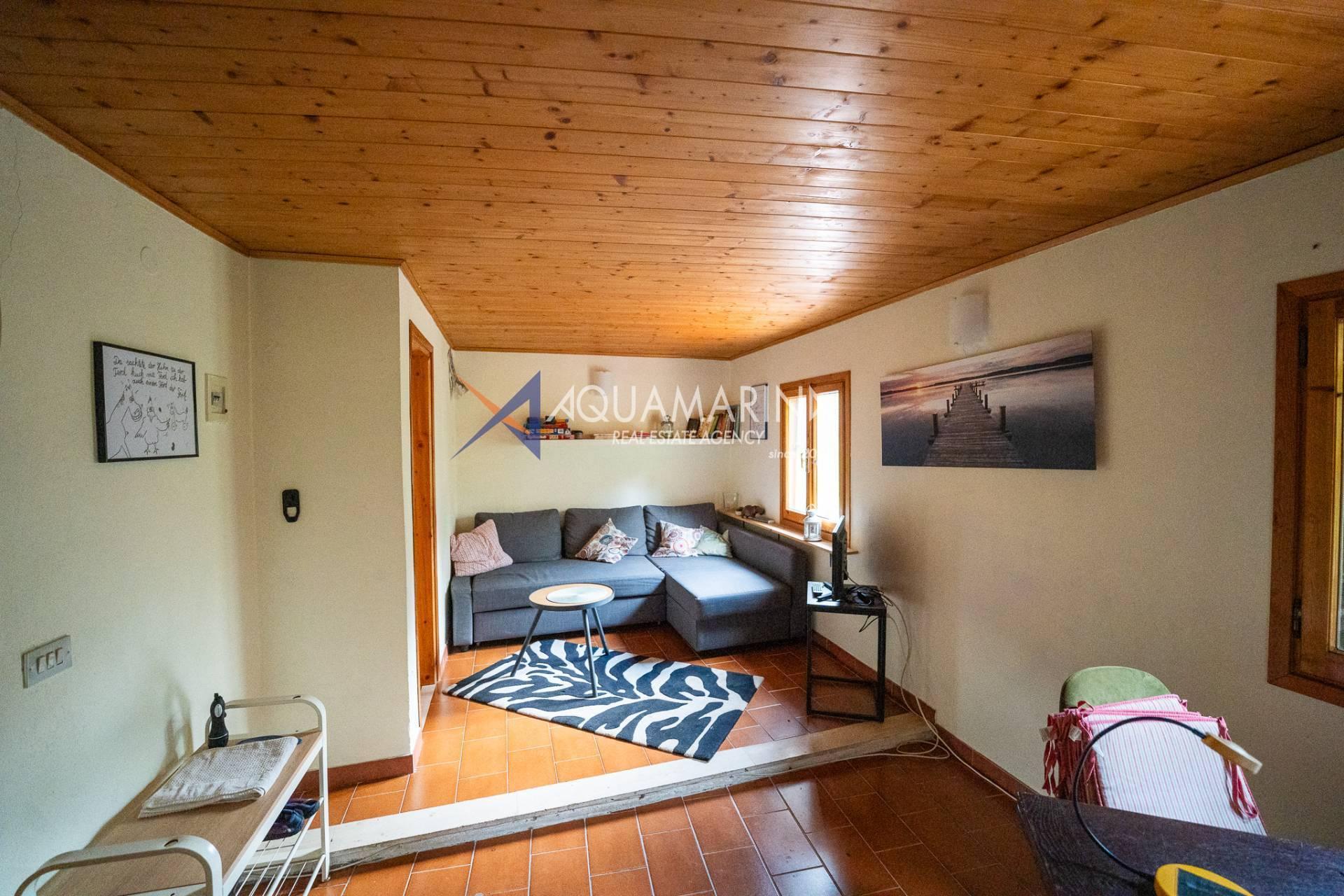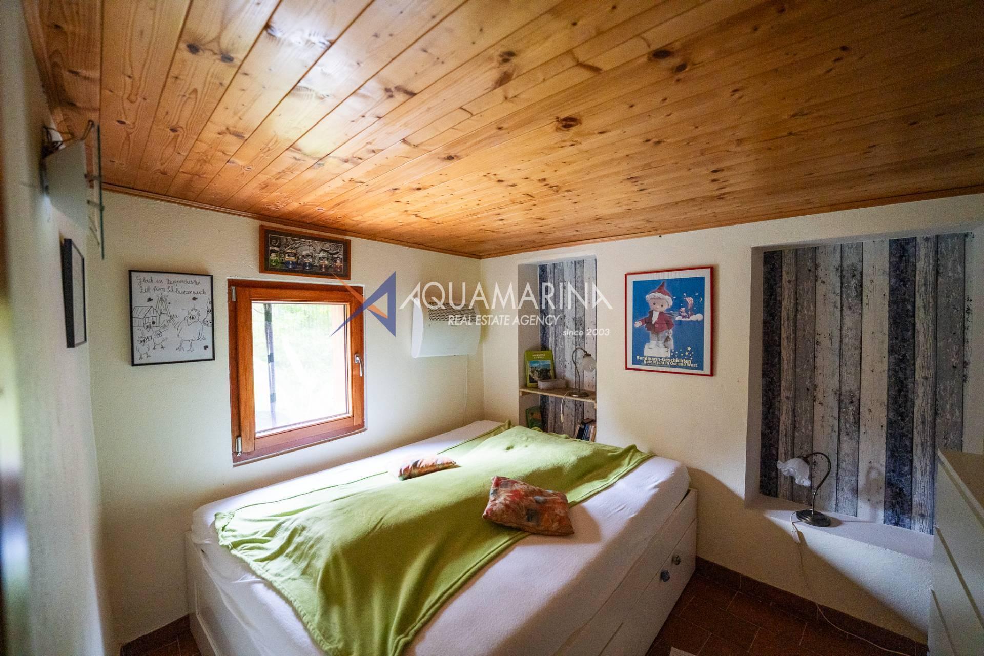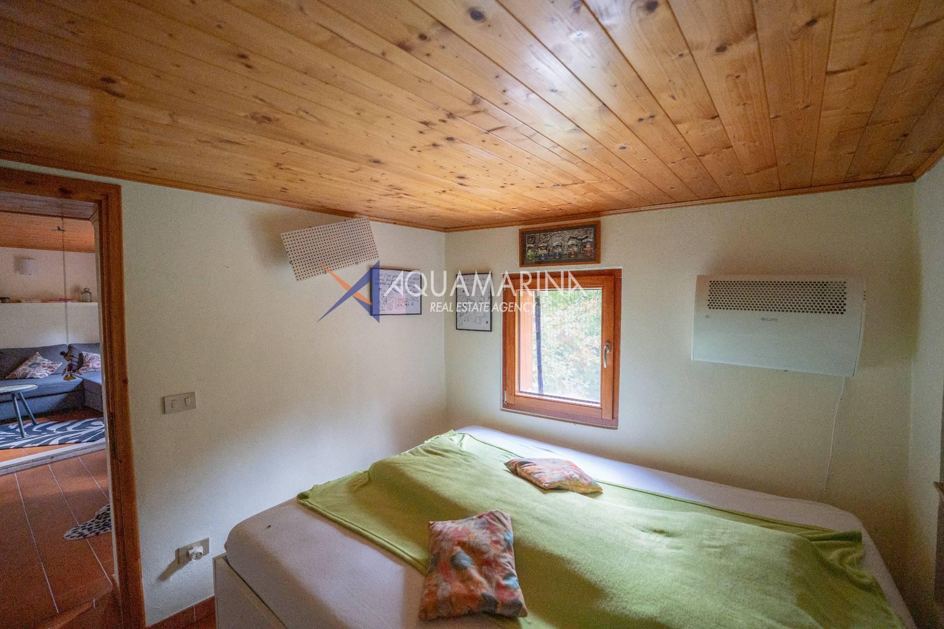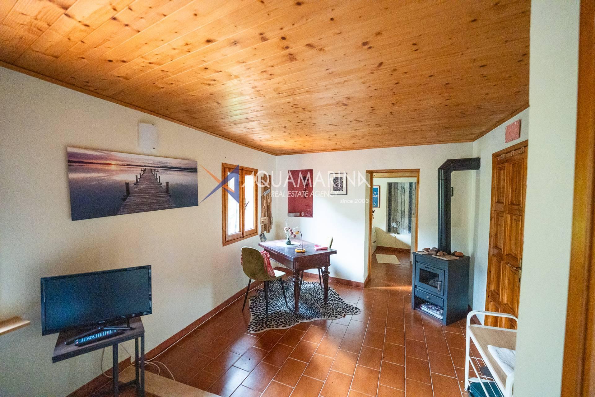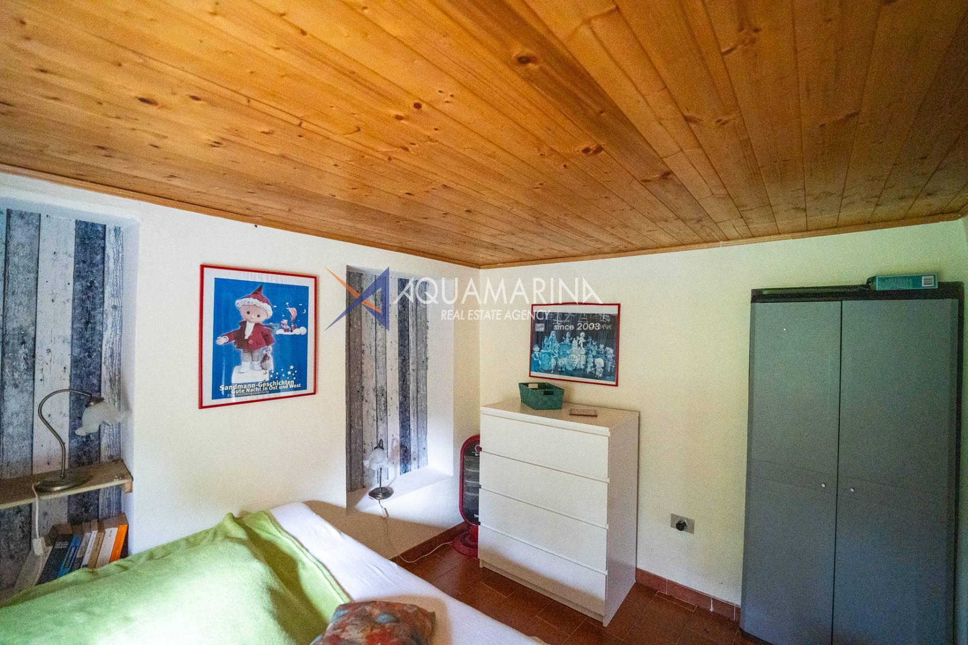 Il piano superiore ospita una camera matrimoniale, un soggiornino con divano, tv satellitare e stufa a legna, ed un bagno con doccia e lavatrice.