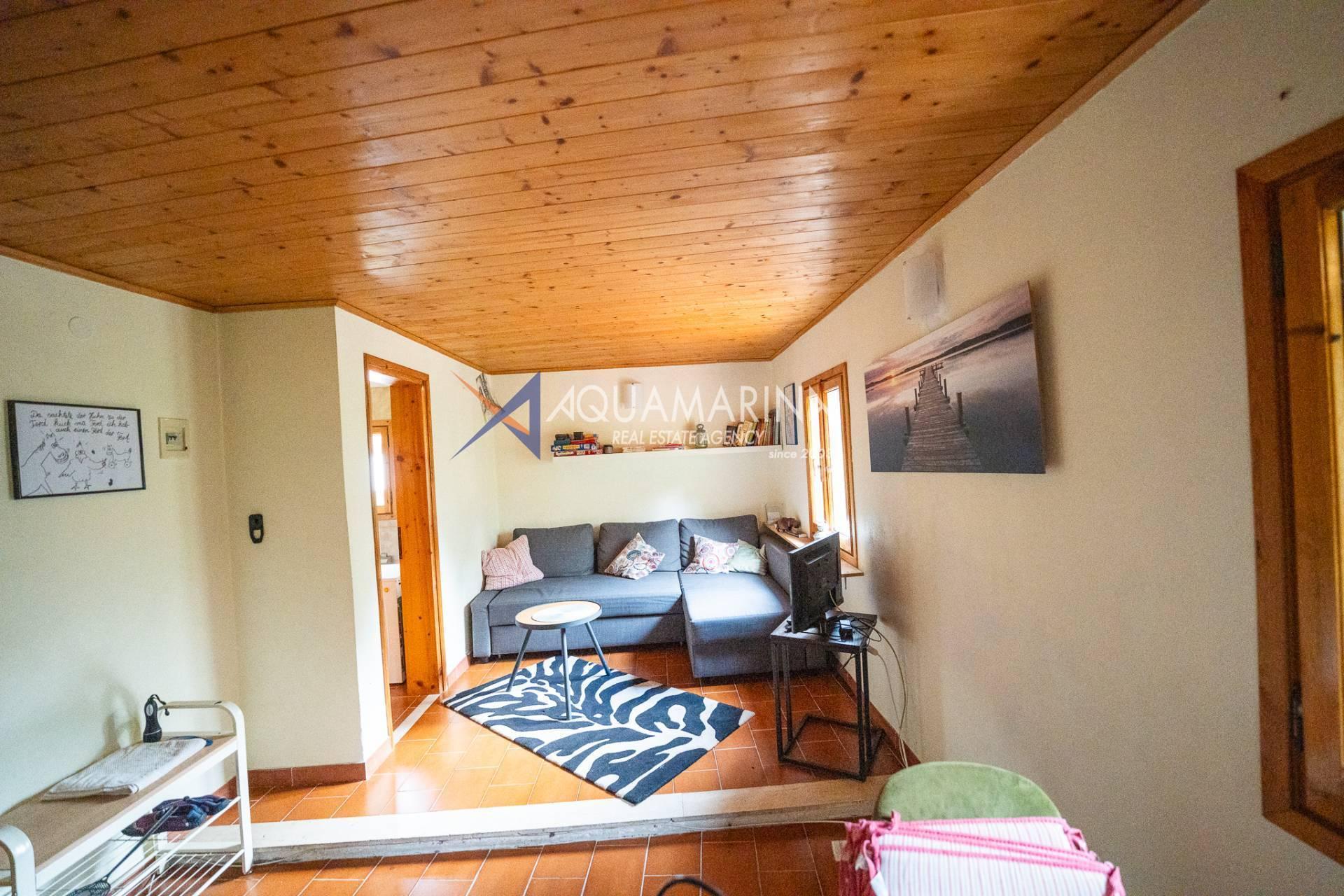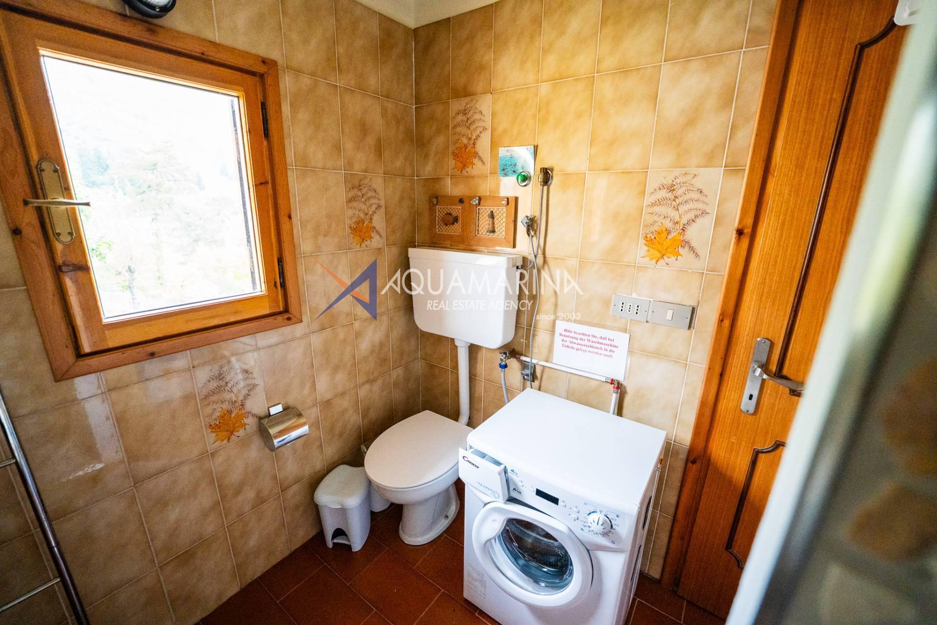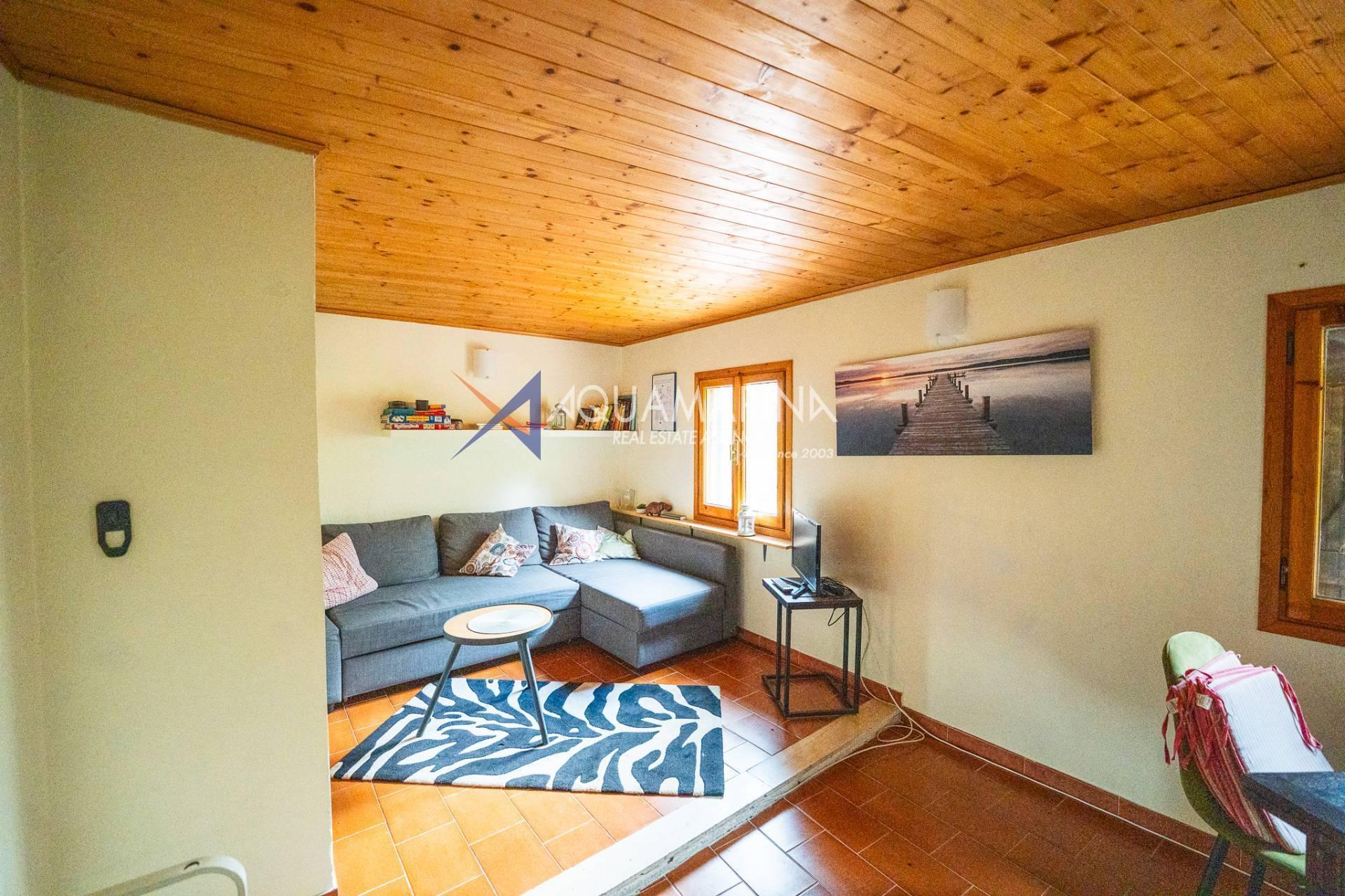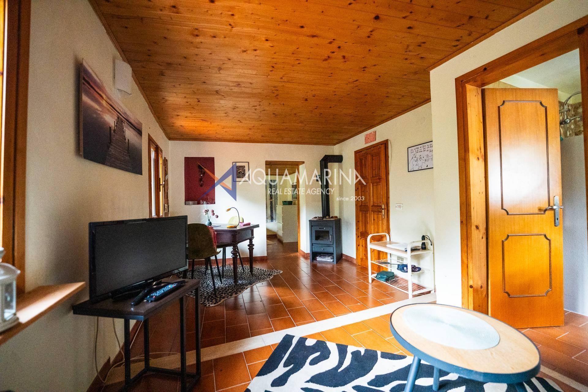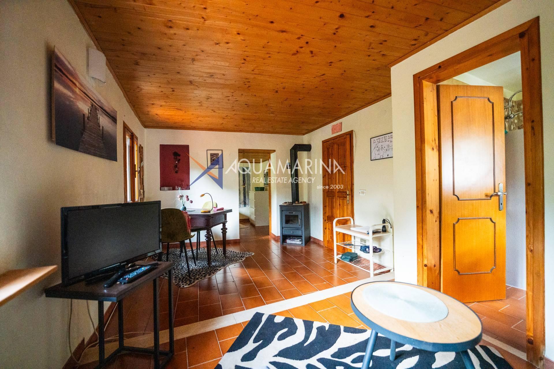 Il piano superiore ospita una camera matrimoniale, un soggiornino con divano, tv satellitare e stufa a legna, ed un bagno con doccia e lavatrice.