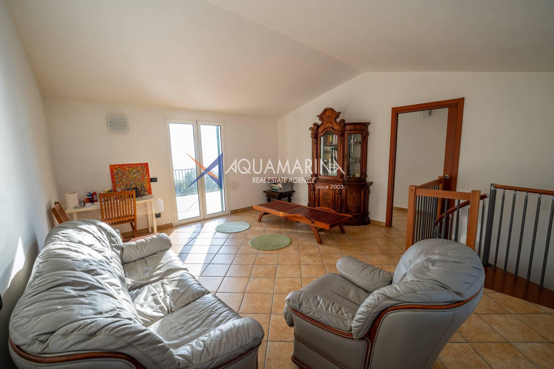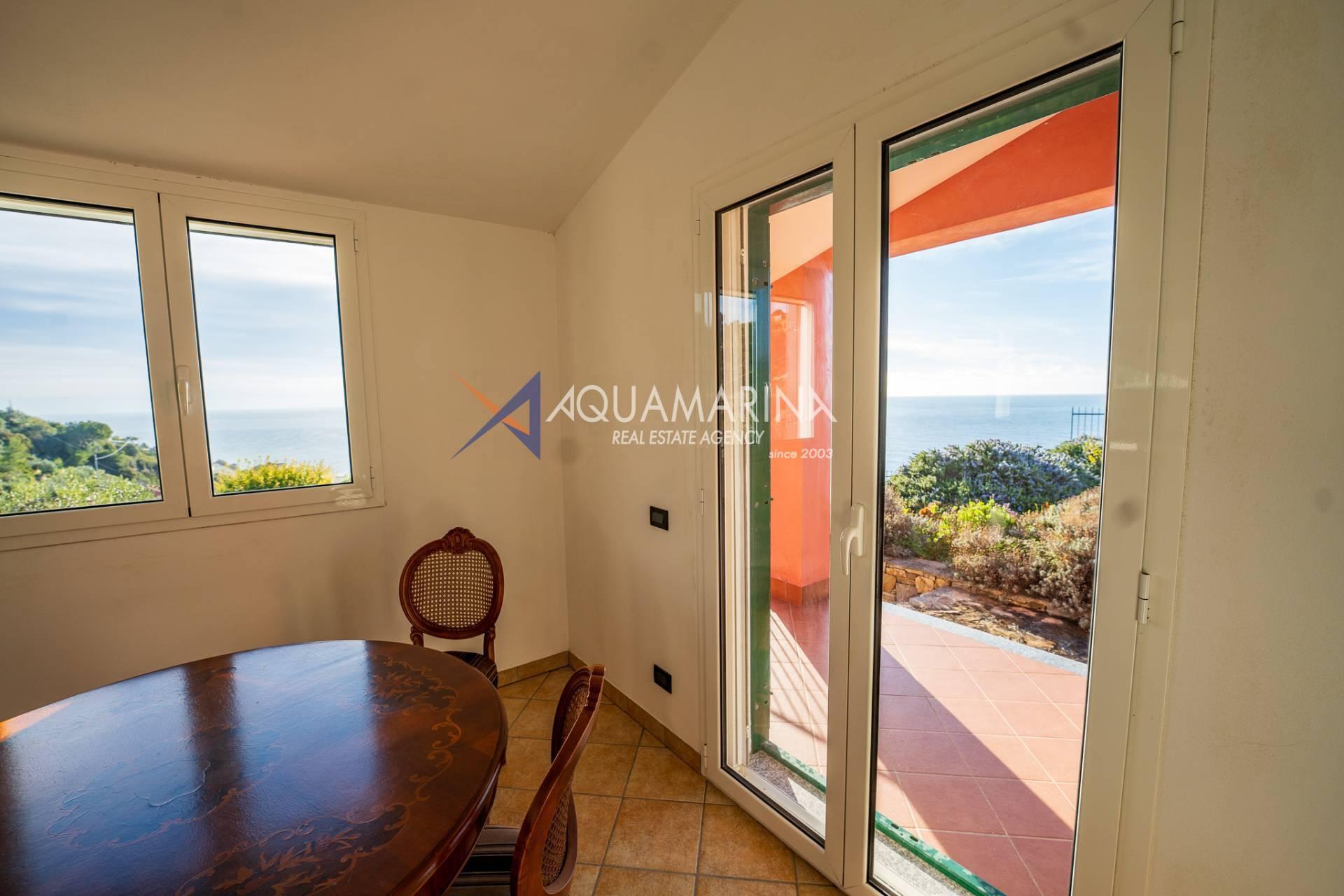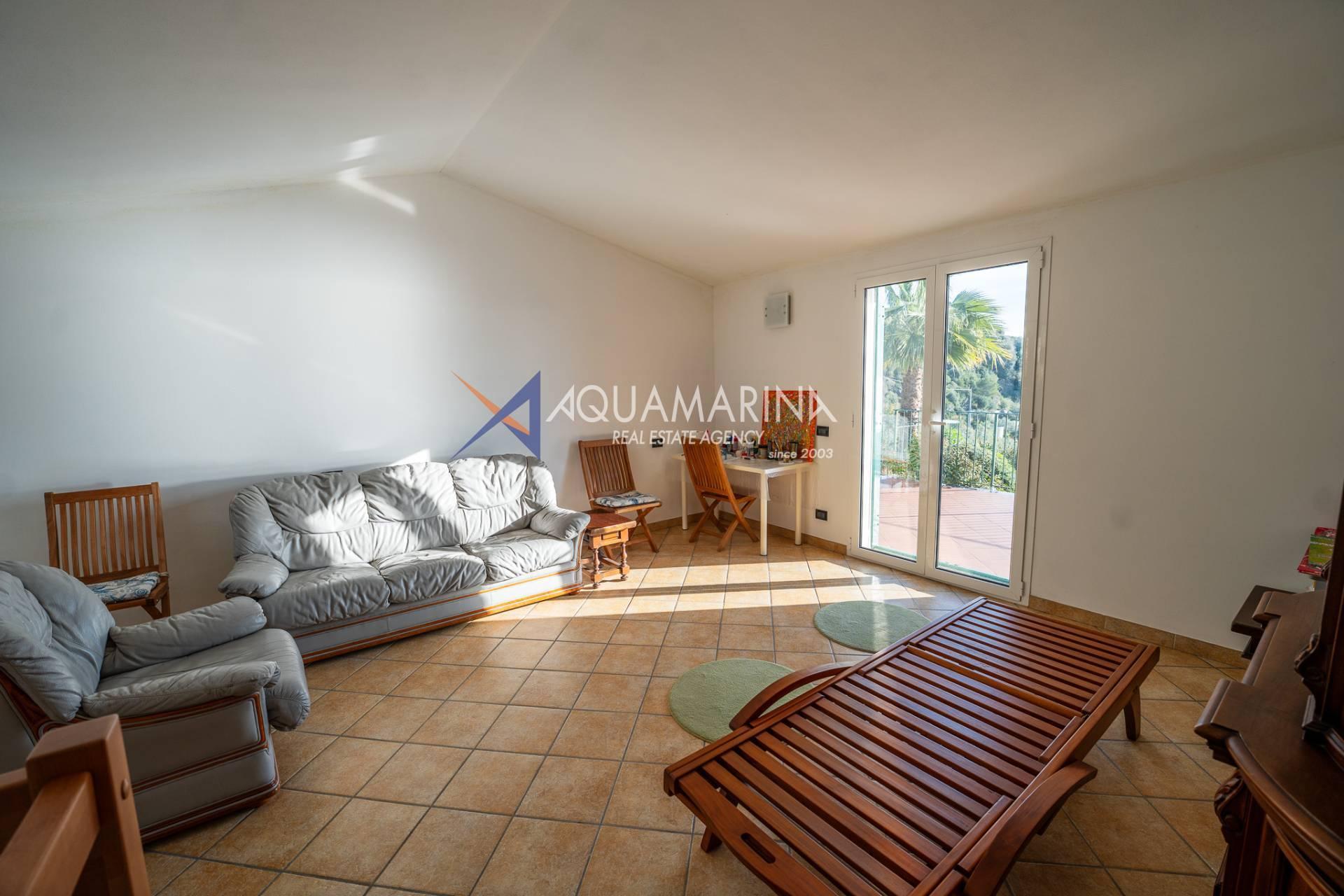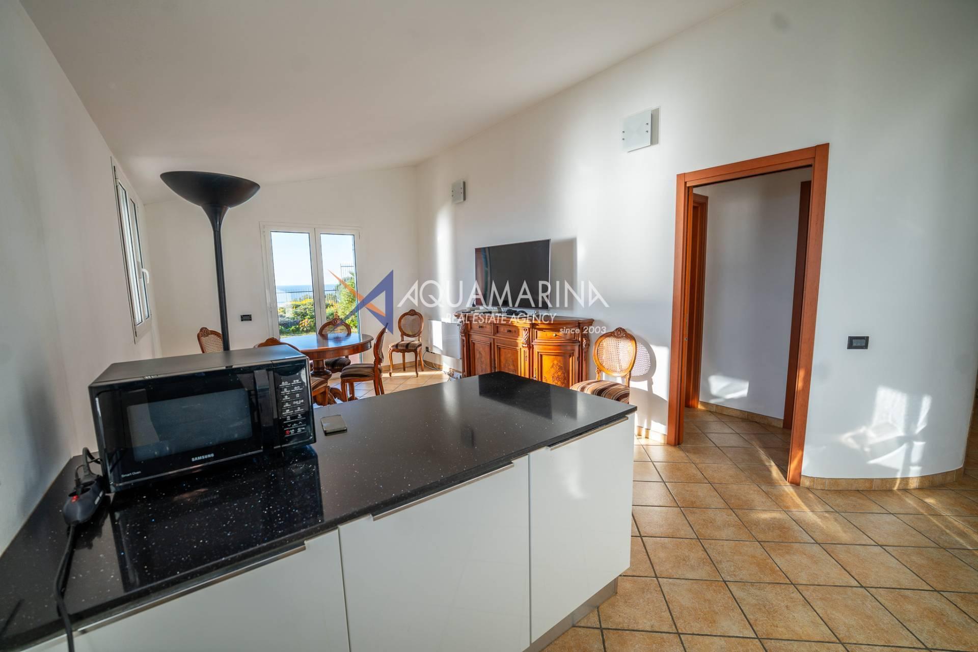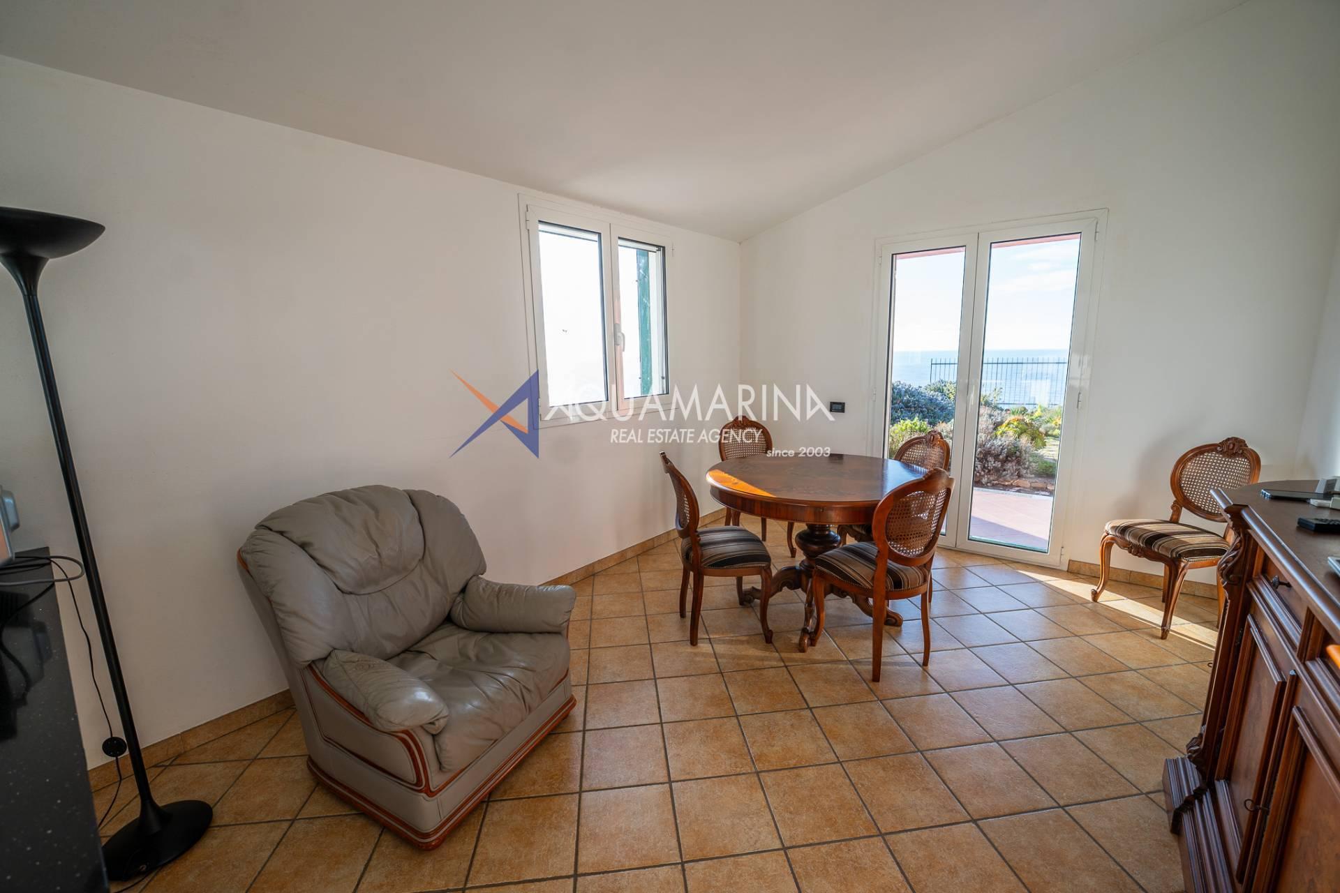 L'abitazione si sviluppa su due livelli: al piano terra l'ingresso si apre su un'ampia e luminosa zona living con cucina a vista, baciata dal sole e con incantevole affaccio sul mare; la zona notte comprende una spaziosa camera matrimoniale con porta finestra vista mare e un ulteriore ampio locale, attualmente adibito a studio/zona hobby, facilmente trasformabile in seconda camera da letto. Completa il piano un bagno finestrato con box doccia.