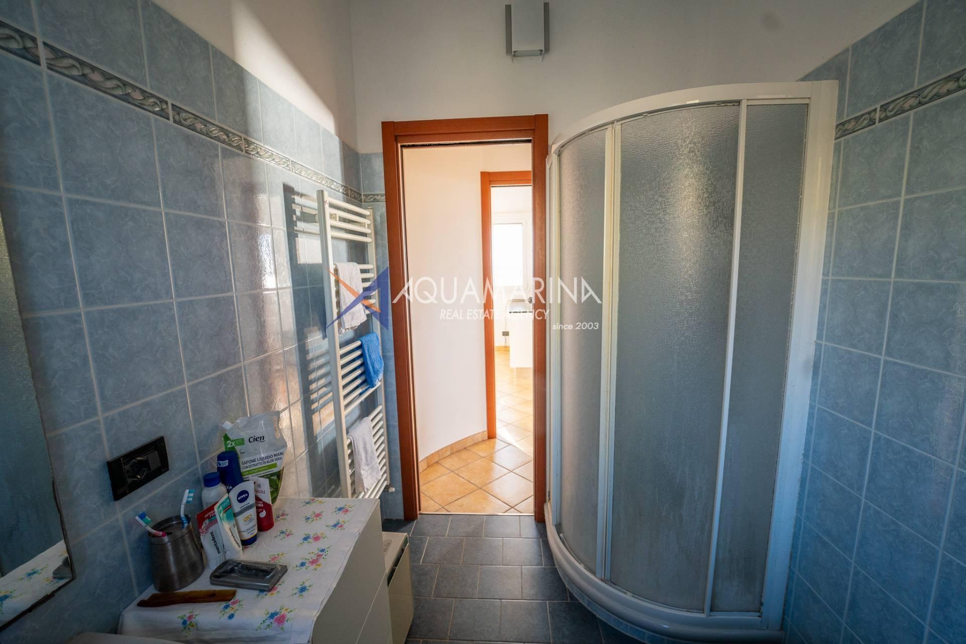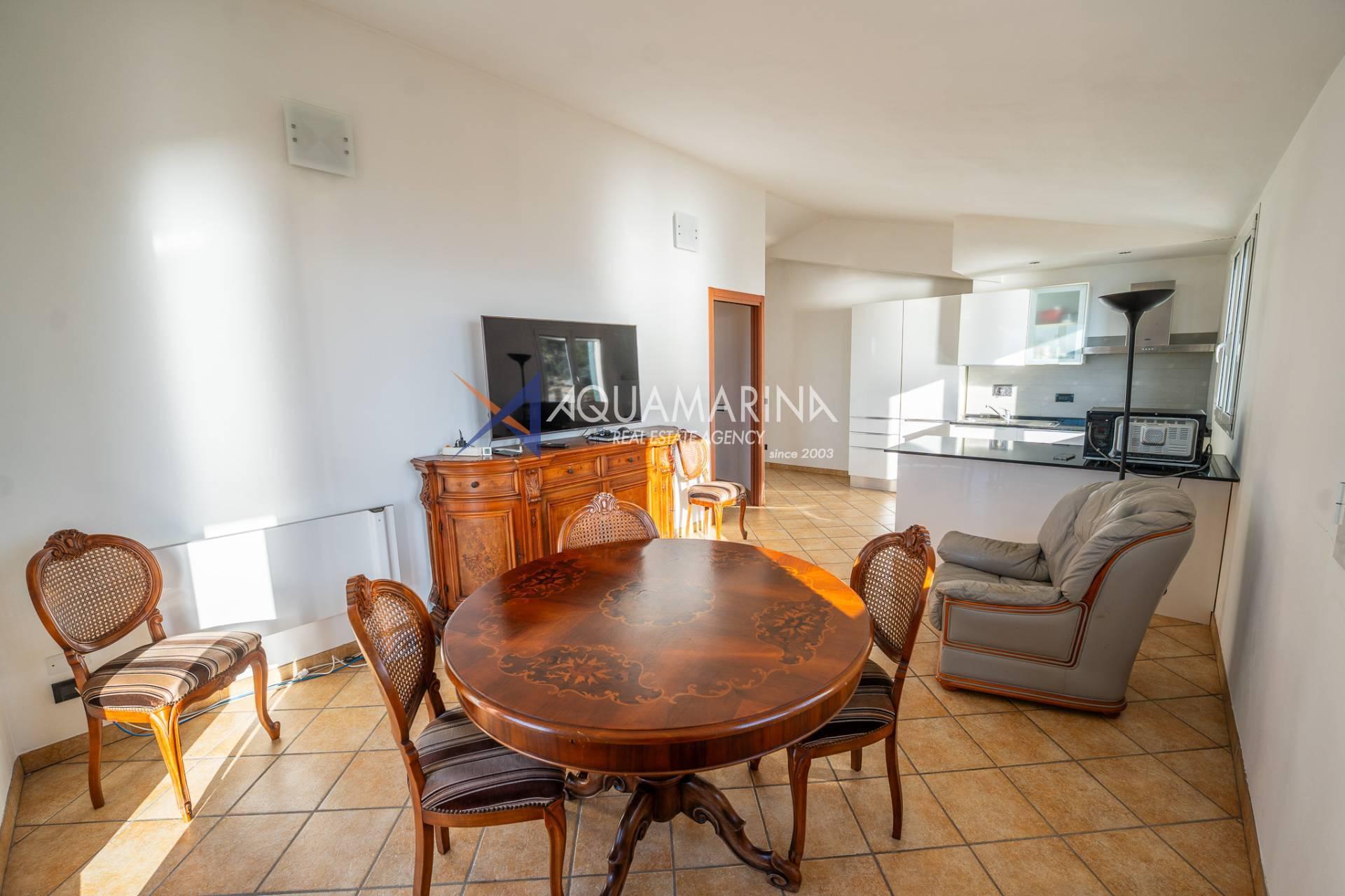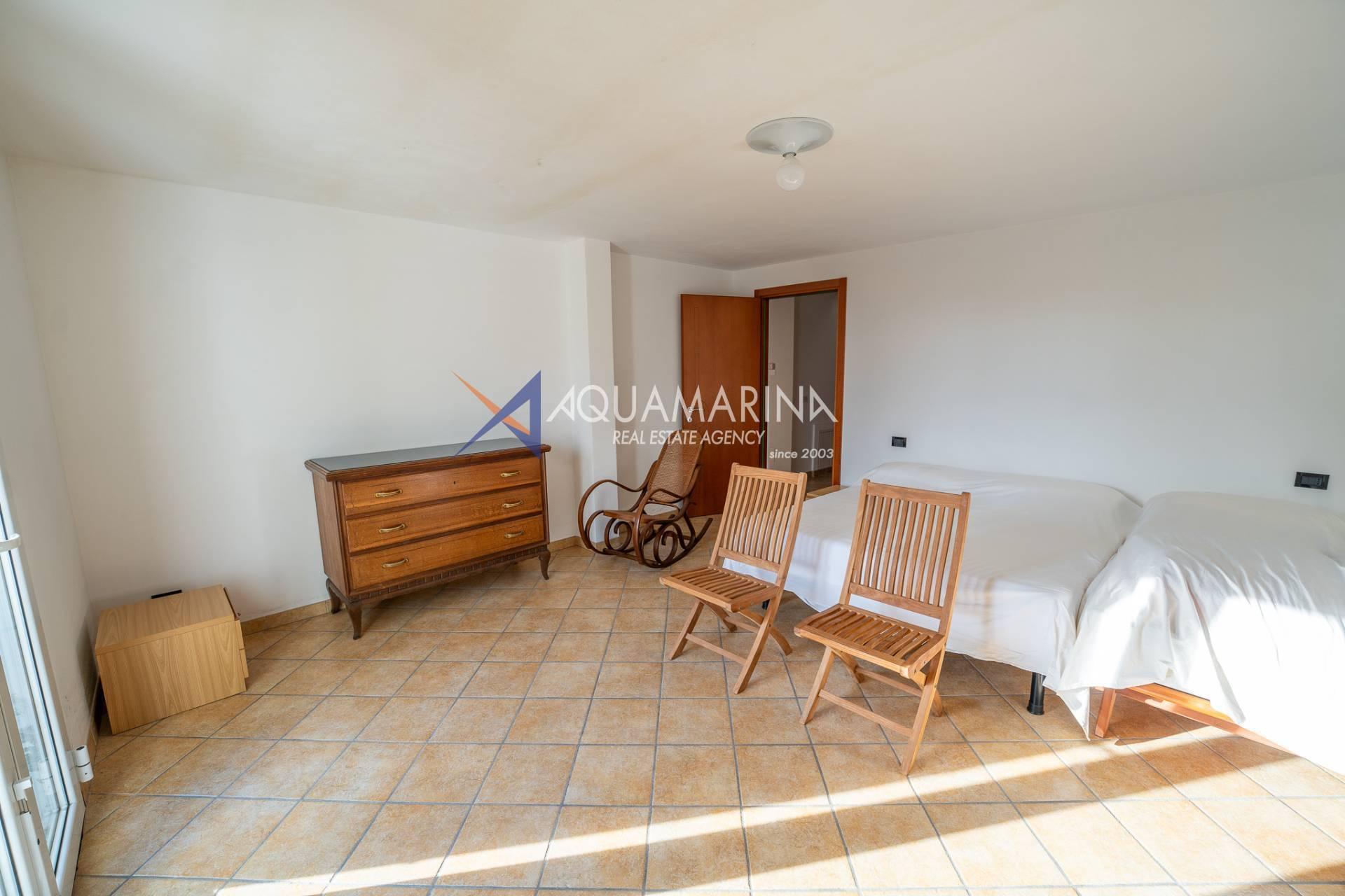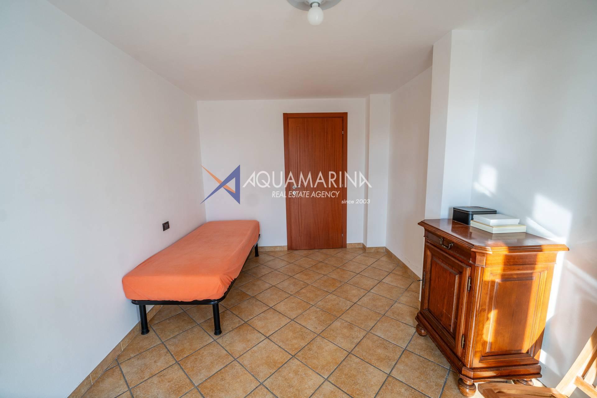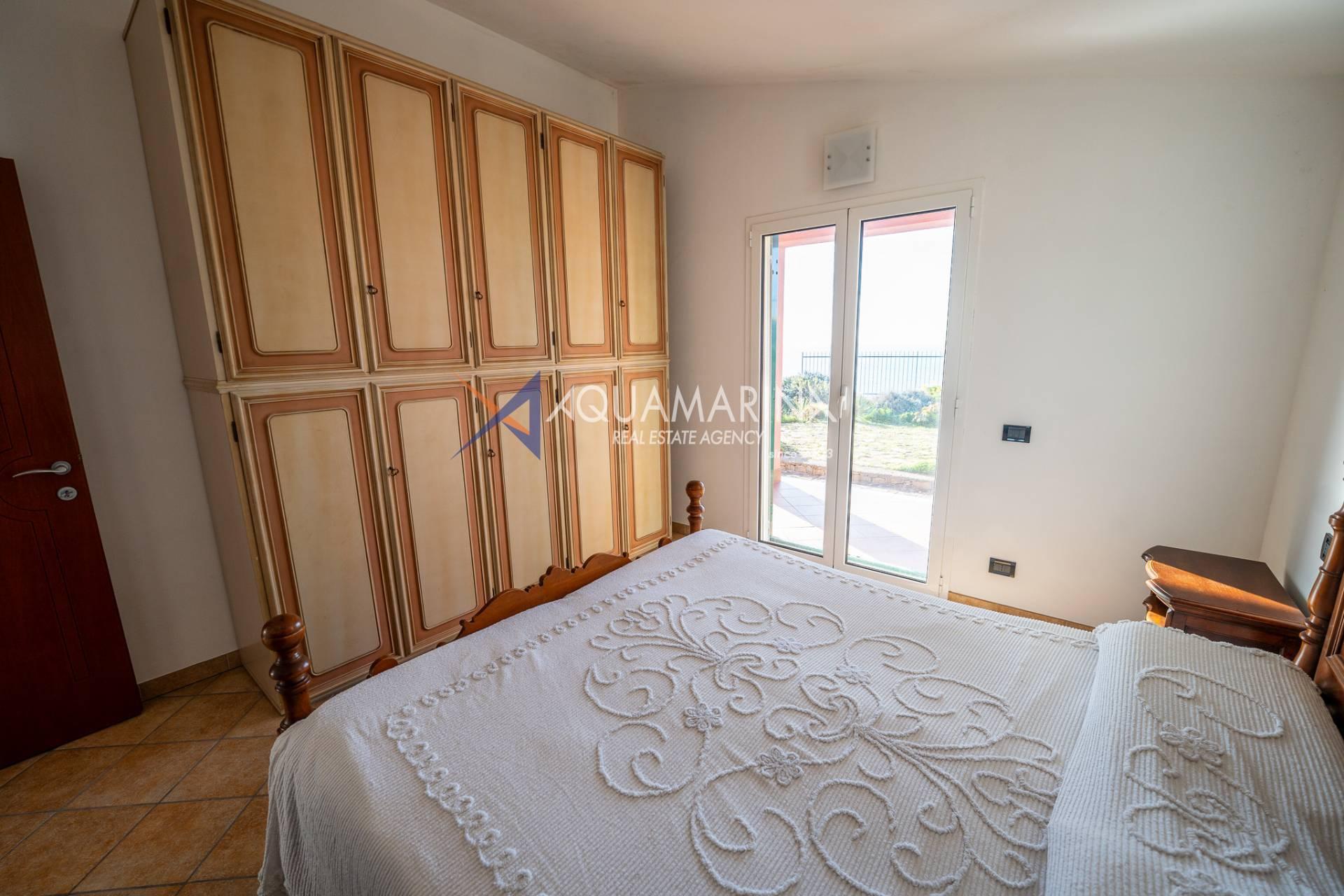 L'abitazione si sviluppa su due livelli: al piano terra l'ingresso si apre su un'ampia e luminosa zona living con cucina a vista, baciata dal sole e con incantevole affaccio sul mare; la zona notte comprende una spaziosa camera matrimoniale con porta finestra vista mare e un ulteriore ampio locale, attualmente adibito a studio/zona hobby, facilmente trasformabile in seconda camera da letto. Completa il piano un bagno finestrato con box doccia.