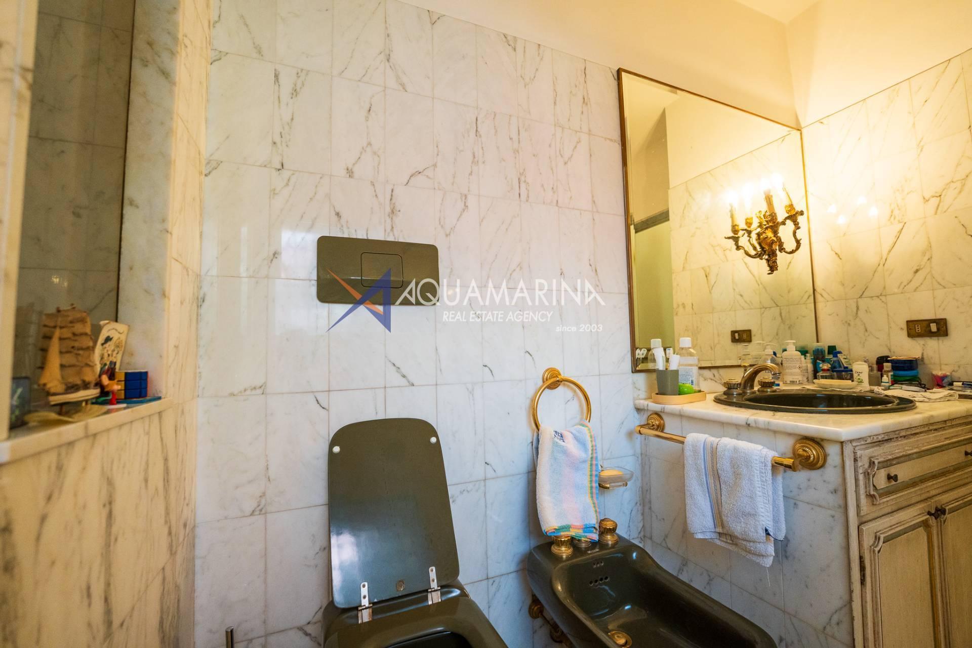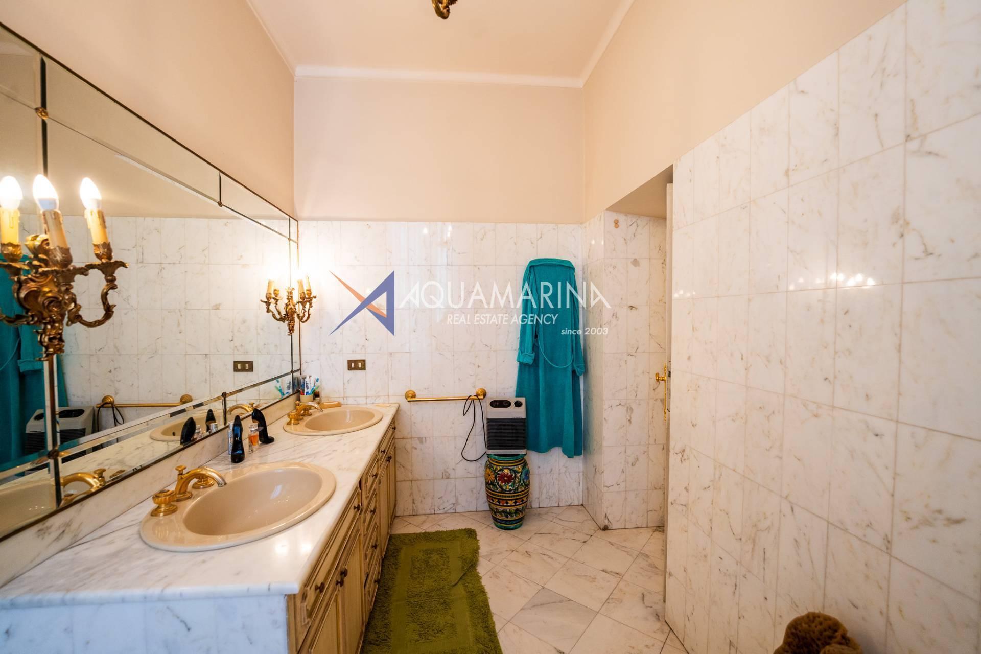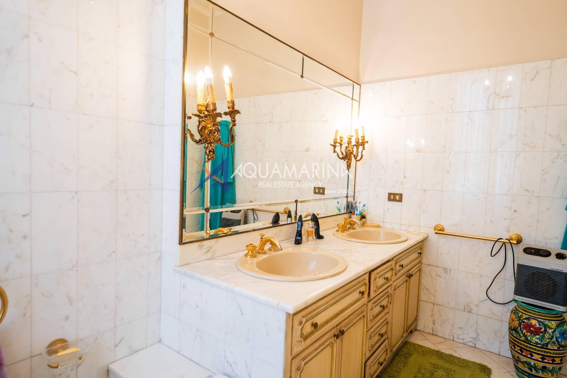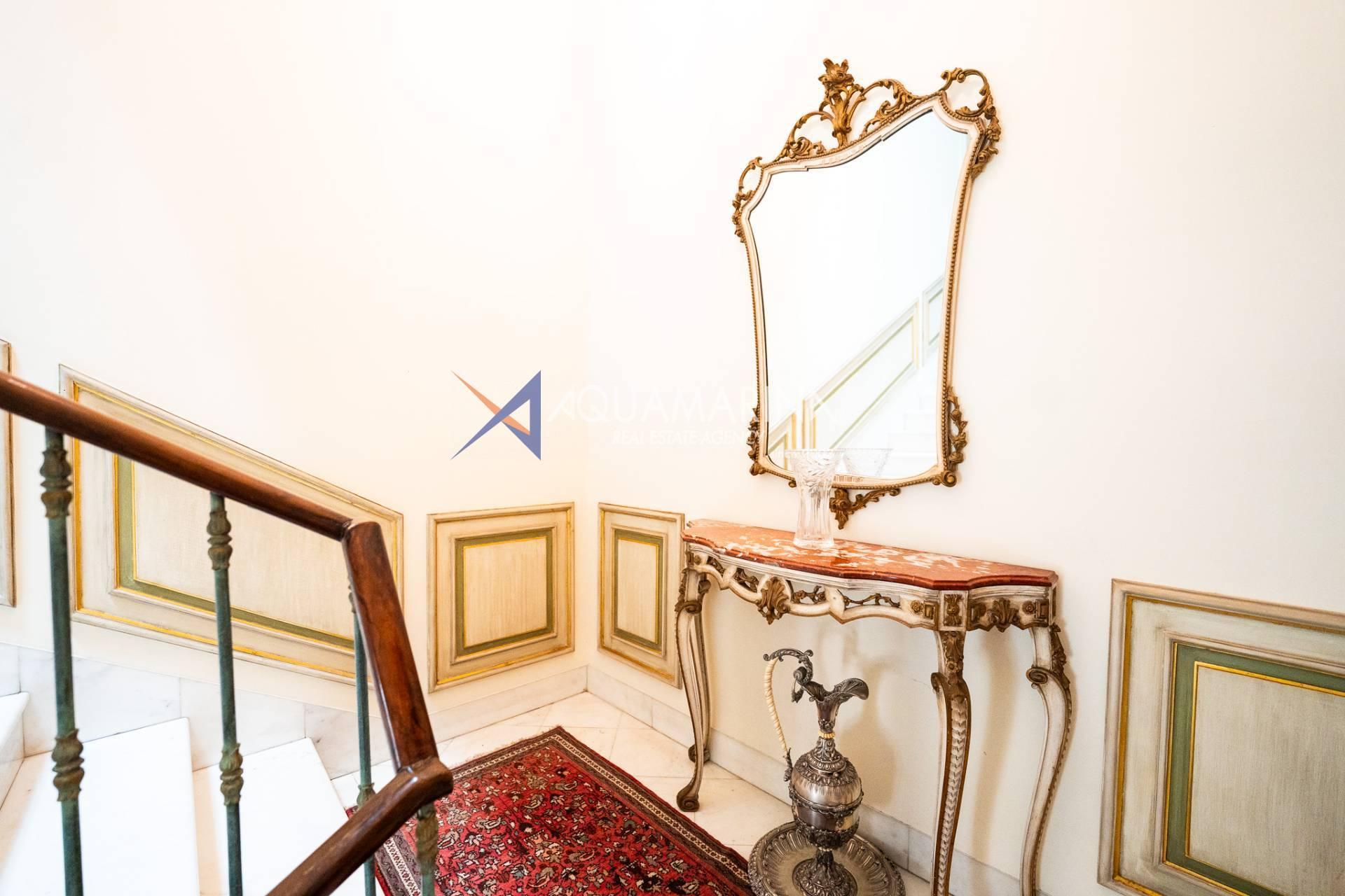 Al piano terra si trovano due ampi saloni, uno dedicato al ricevimento e l'altro alla sala da pranzo e soggiorno, completati da una cucina abitabile, una lavanderia, un bagno e un ripostiglio con dispensa, con accesso al cortile tramite un secondo ingresso. Al piano ammezzato è presente un bagno con doccia. Il primo piano ospita tre camere da letto con vista mare, un disimpegno, uno studio-salotto con balcone e un grande terrazzo solarium piastrellato con vista mare, accessibile anche a un secondo giardino esclusivo. Completa questa zona un bagno con vasca e l'accesso al mansardato.