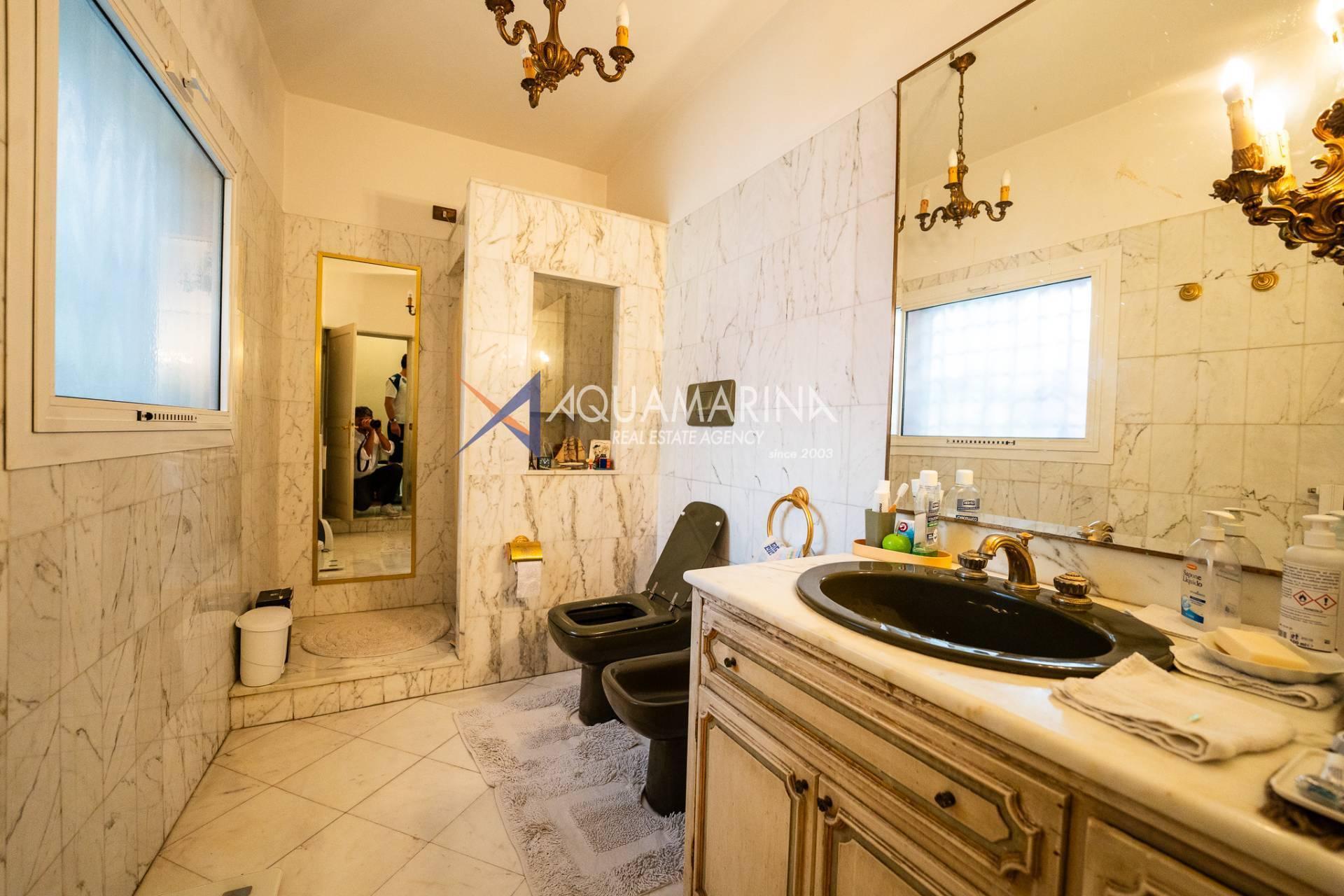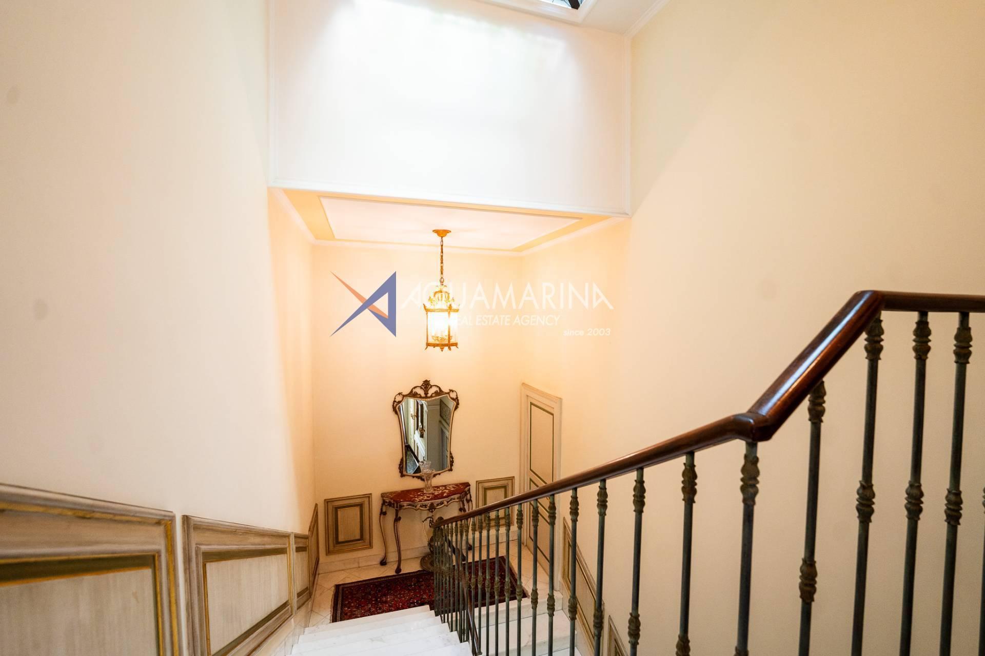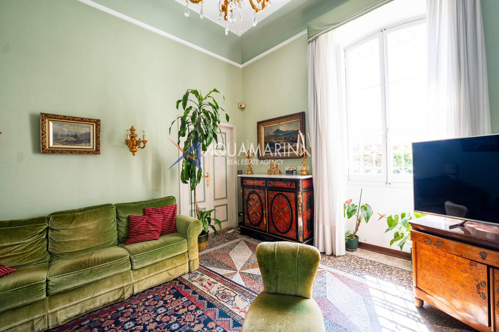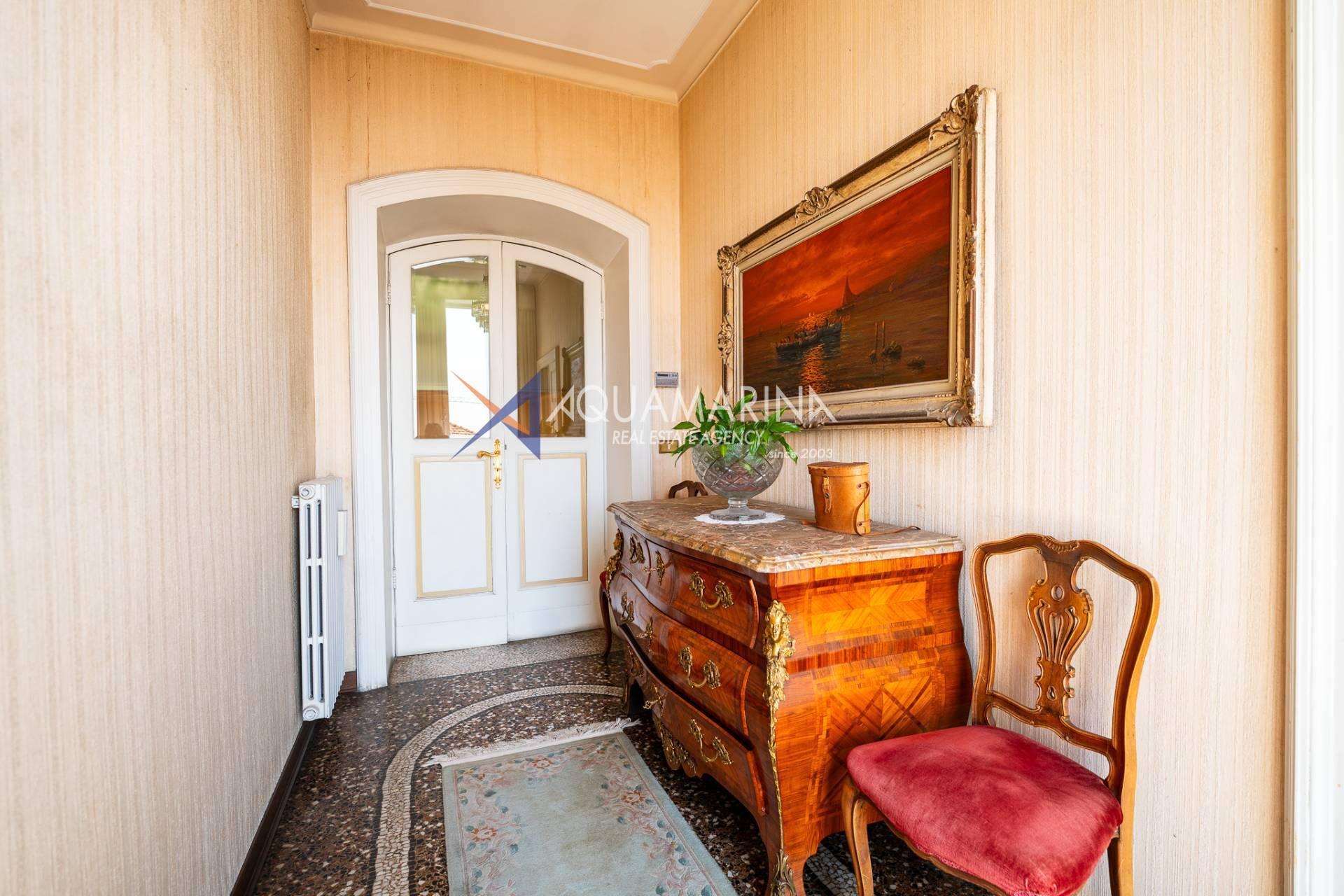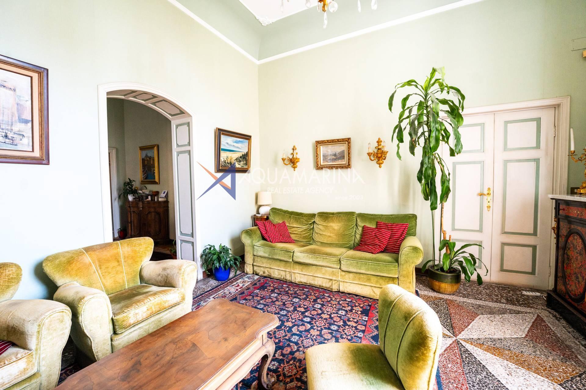 Al piano terra si trovano due ampi saloni, uno dedicato al ricevimento e l'altro alla sala da pranzo e soggiorno, completati da una cucina abitabile, una lavanderia, un bagno e un ripostiglio con dispensa, con accesso al cortile tramite un secondo ingresso. Al piano ammezzato è presente un bagno con doccia. Il primo piano ospita tre camere da letto con vista mare, un disimpegno, uno studio-salotto con balcone e un grande terrazzo solarium piastrellato con vista mare, accessibile anche a un secondo giardino esclusivo. Completa questa zona un bagno con vasca e l'accesso al mansardato.