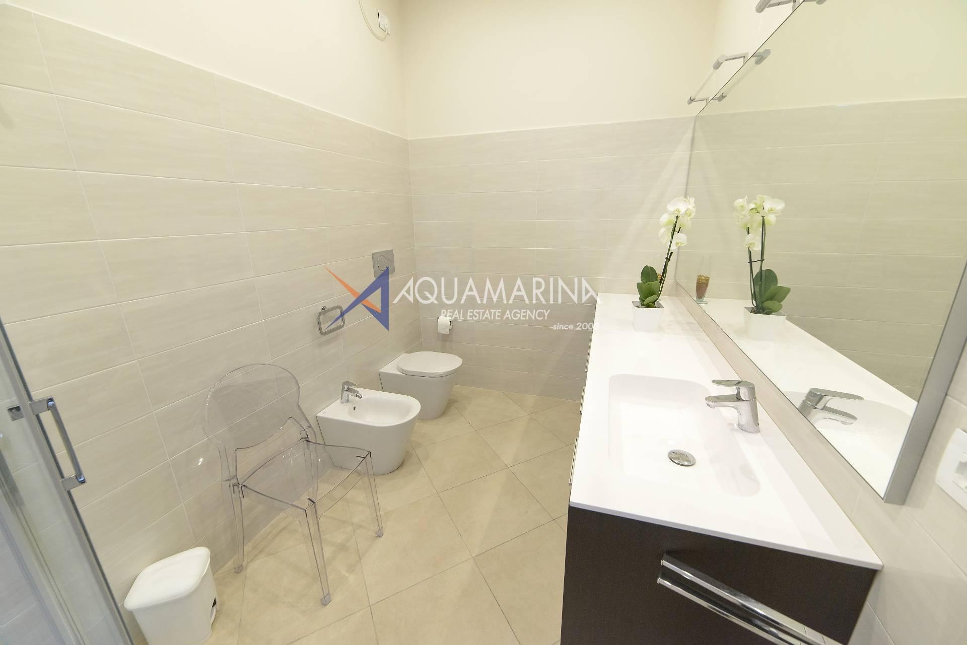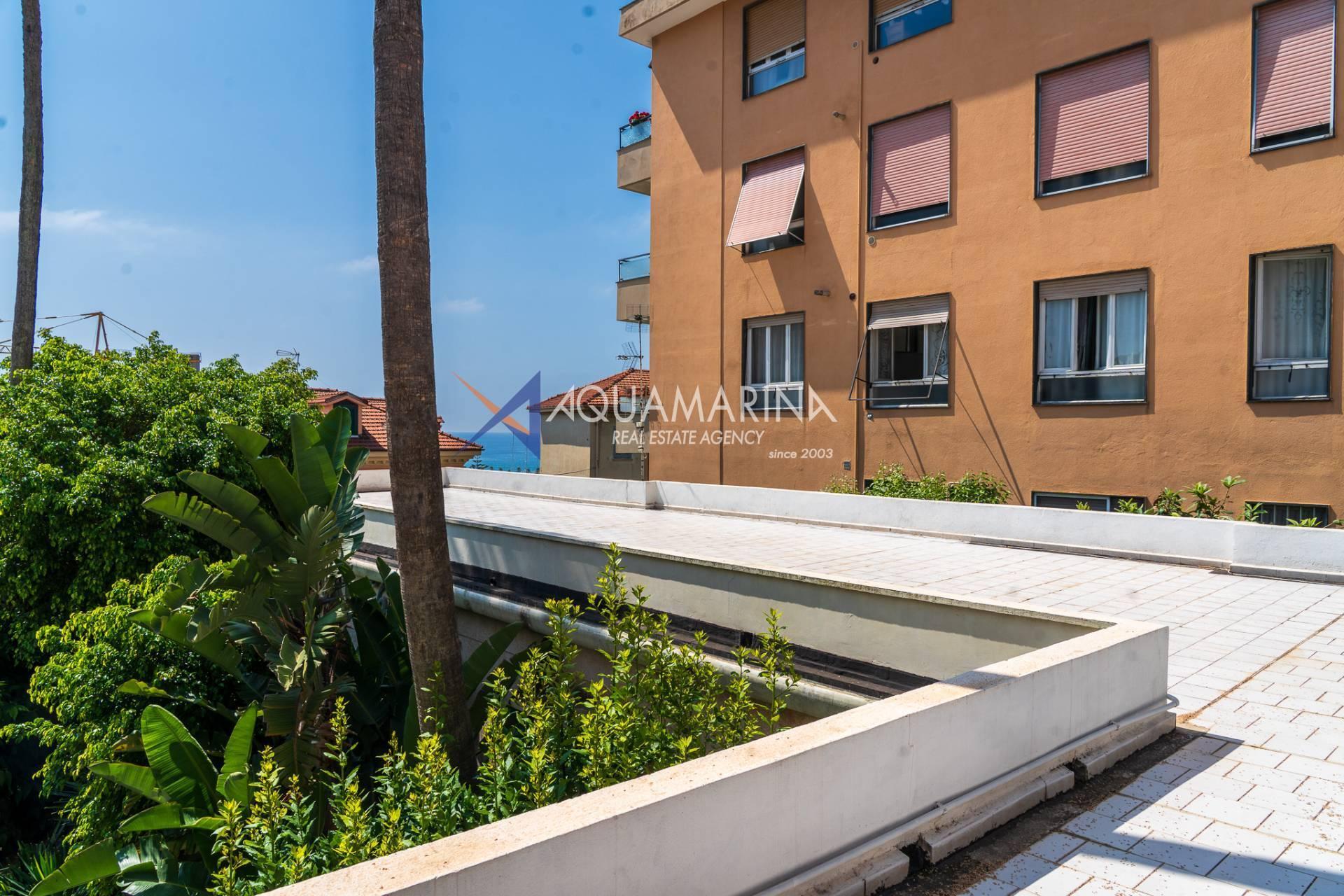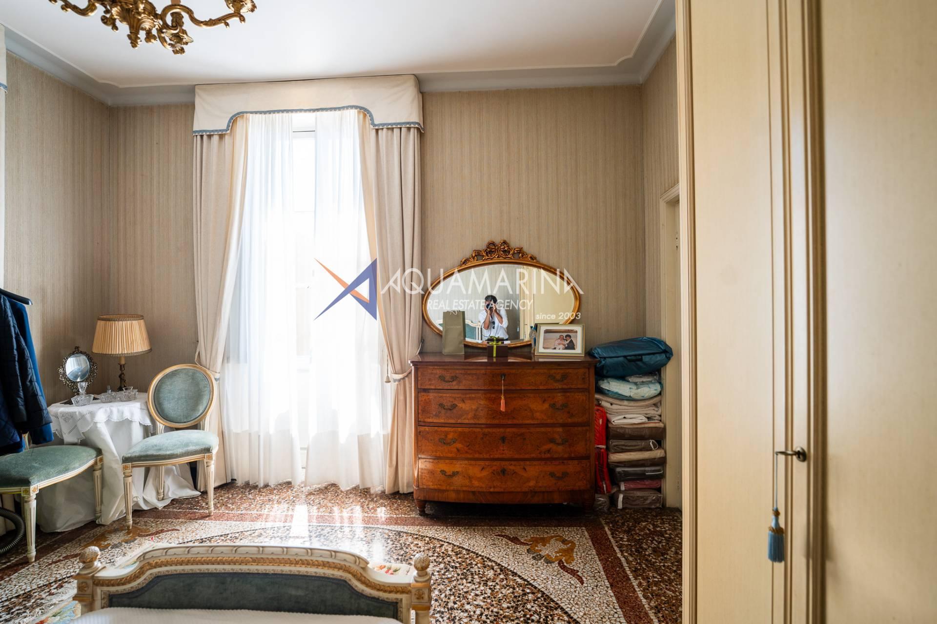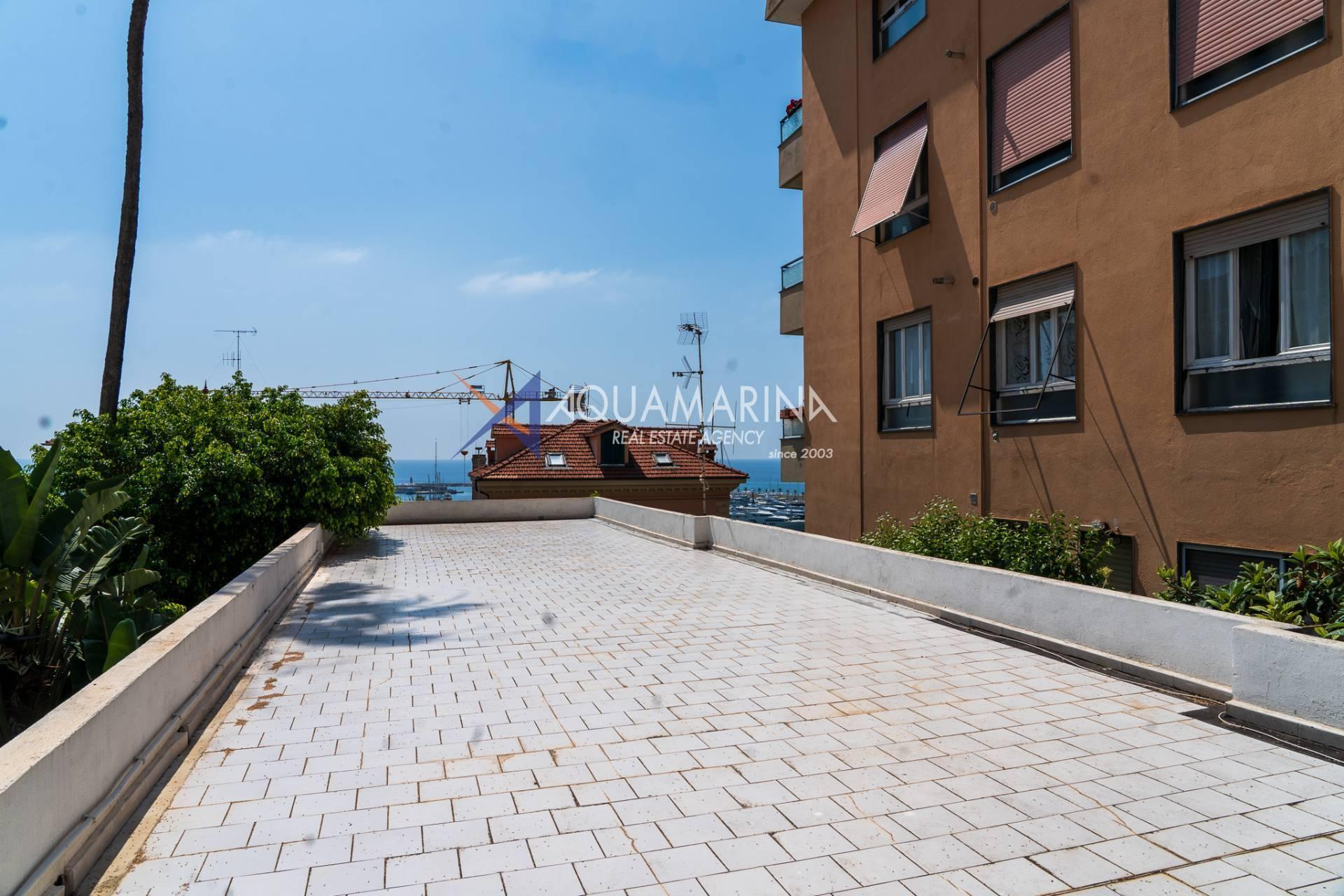 Al piano terra si trovano due ampi saloni, uno dedicato al ricevimento e l'altro alla sala da pranzo e soggiorno, completati da una cucina abitabile, una lavanderia, un bagno e un ripostiglio con dispensa, con accesso al cortile tramite un secondo ingresso. Al piano ammezzato è presente un bagno con doccia. Il primo piano ospita tre camere da letto con vista mare, un disimpegno, uno studio-salotto con balcone e un grande terrazzo solarium piastrellato con vista mare, accessibile anche a un secondo giardino esclusivo. Completa questa zona un bagno con vasca e l'accesso al mansardato.