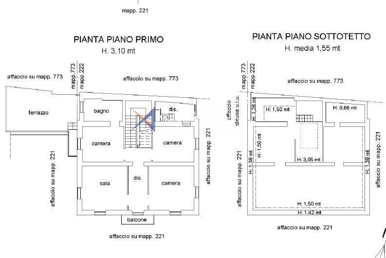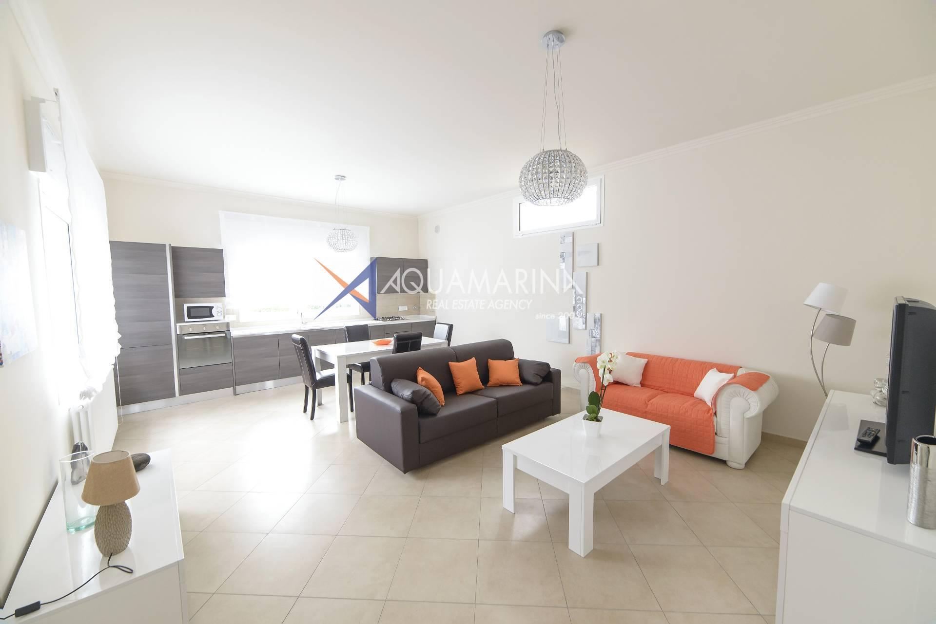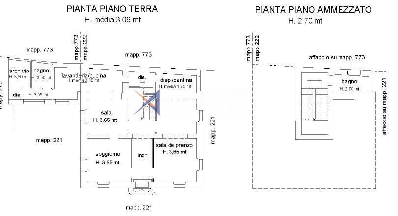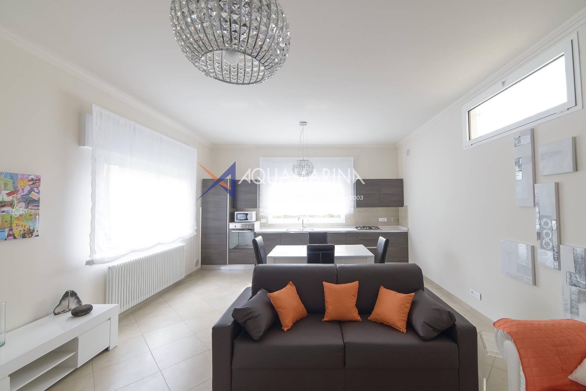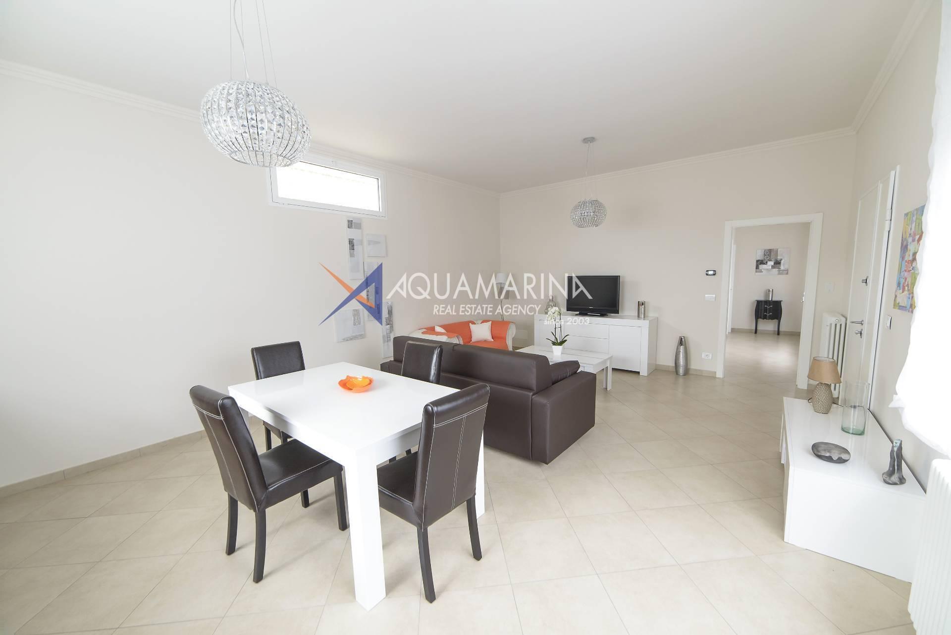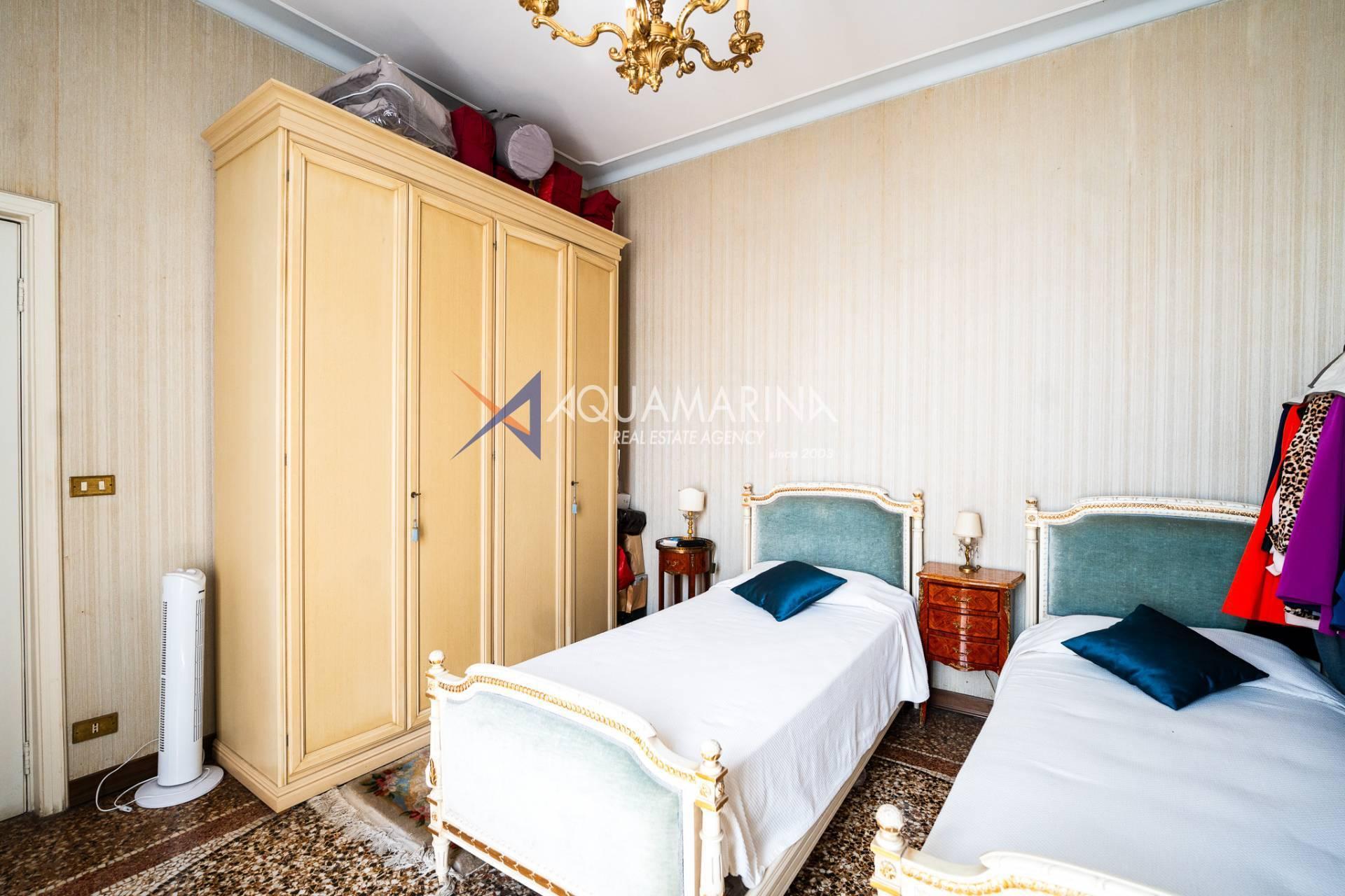 Al piano terra si trovano due ampi saloni, uno dedicato al ricevimento e l'altro alla sala da pranzo e soggiorno, completati da una cucina abitabile, una lavanderia, un bagno e un ripostiglio con dispensa, con accesso al cortile tramite un secondo ingresso. Al piano ammezzato è presente un bagno con doccia. Il primo piano ospita tre camere da letto con vista mare, un disimpegno, uno studio-salotto con balcone e un grande terrazzo solarium piastrellato con vista mare, accessibile anche a un secondo giardino esclusivo. Completa questa zona un bagno con vasca e l'accesso al mansardato.