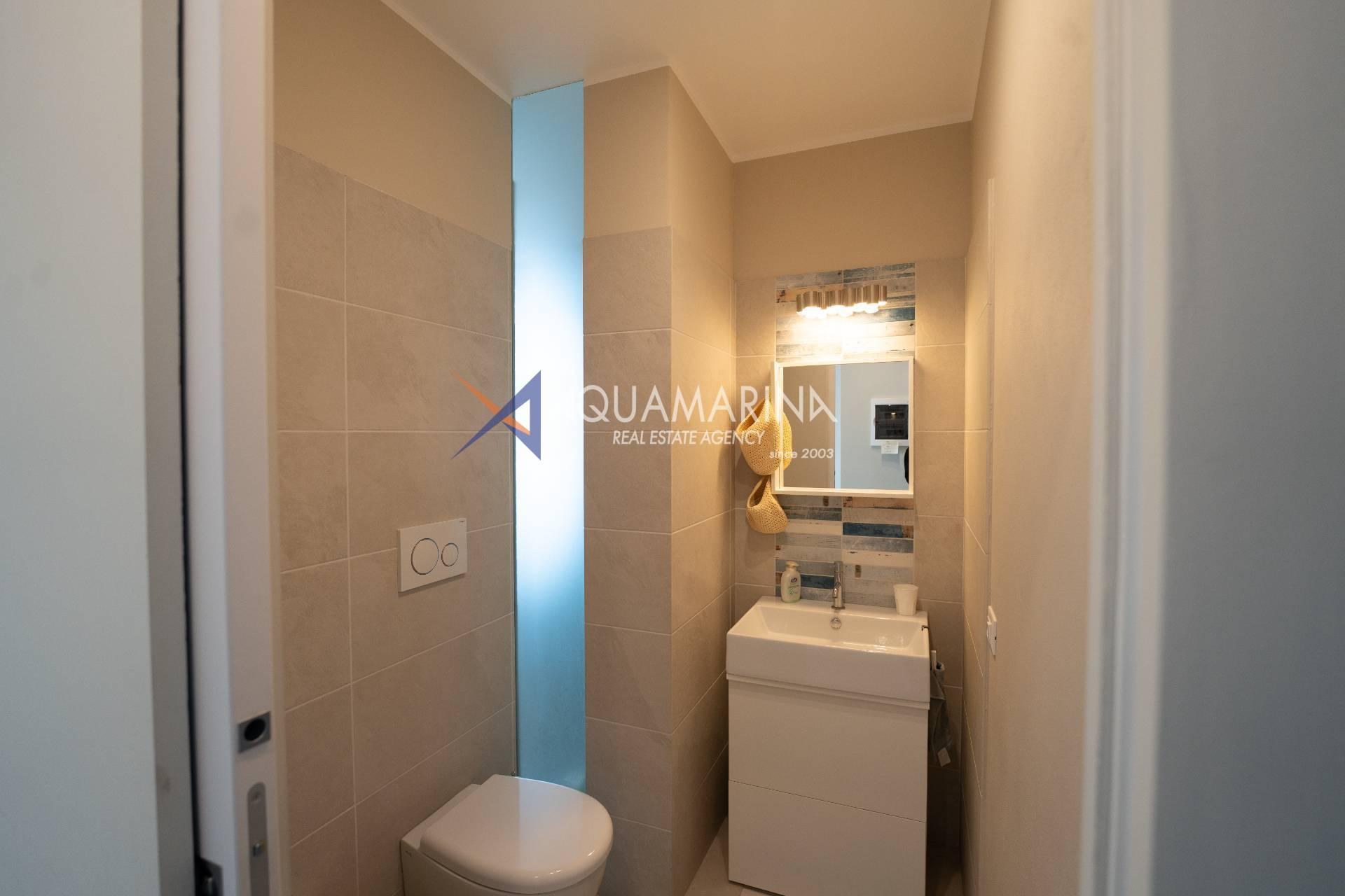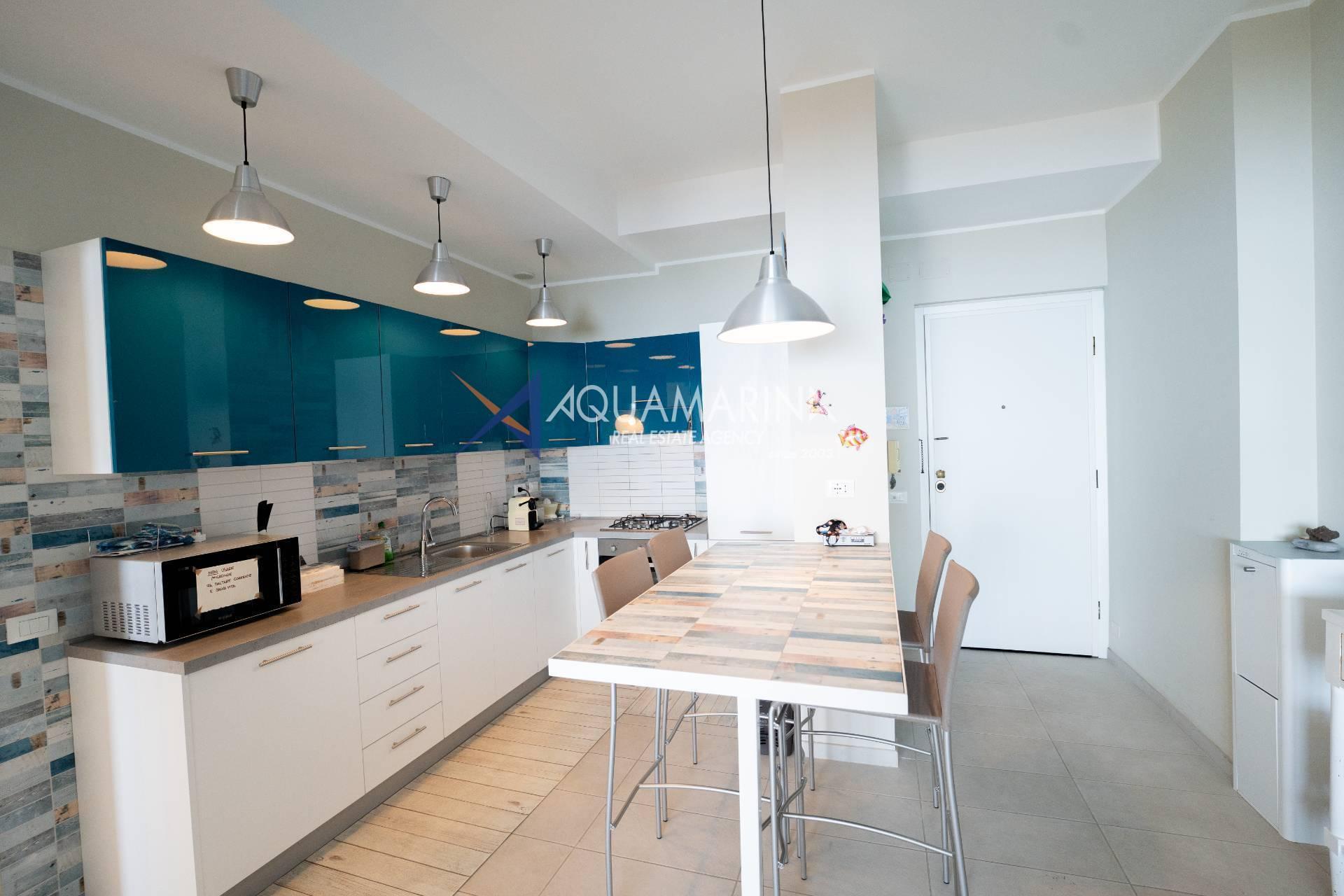 È composto da ingresso, cucina abitabile, ampio soggiorno molto luminoso con accesso diretto alla spettacolare terrazza fronte mare, due bagni e due camere da letto. La camera matrimoniale, particolarmente spaziosa, gode di accesso al terrazzo e di una fantastica vista mare su due lati. Il terrazzo perimetrale è dotato di una comoda doccia esterna.