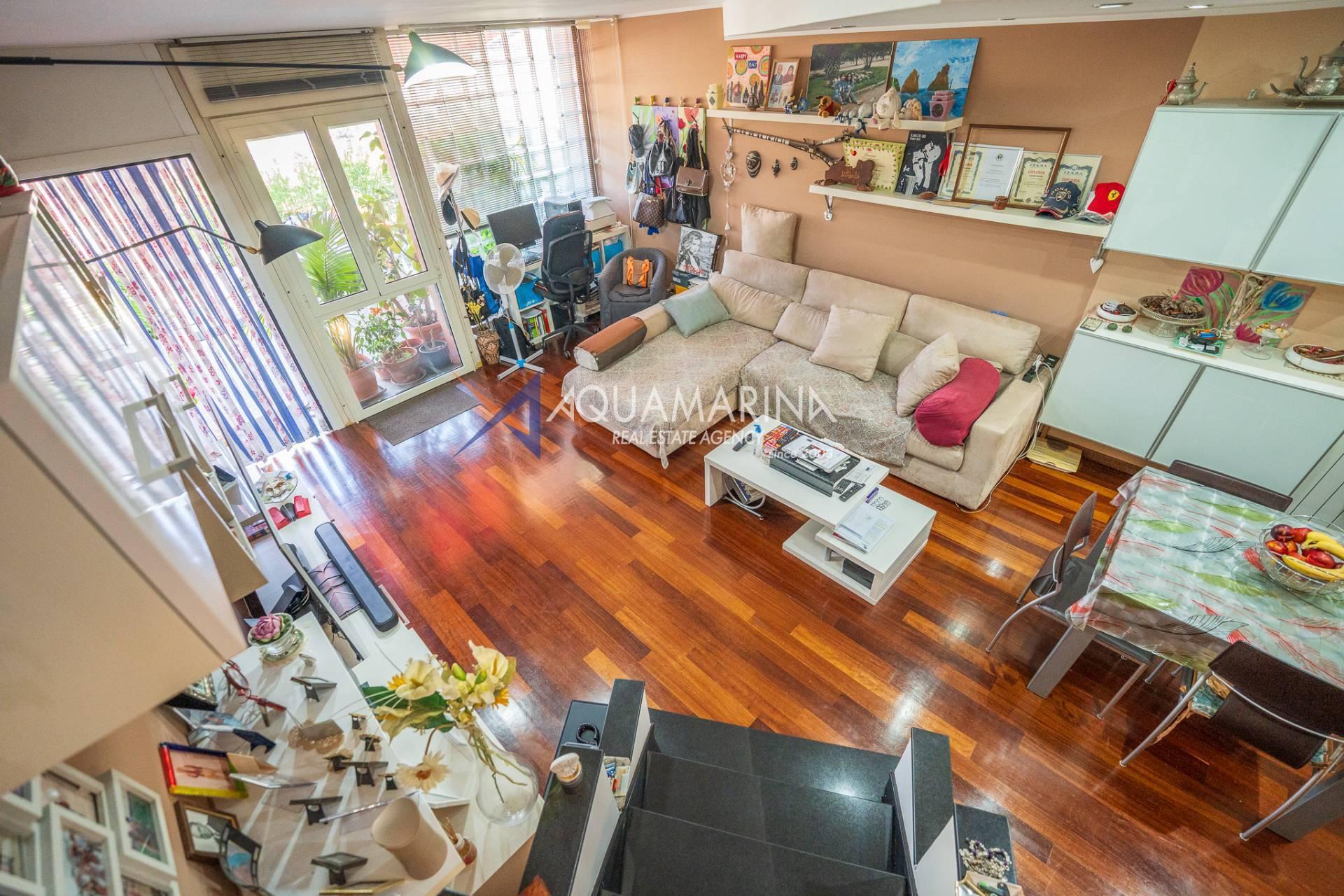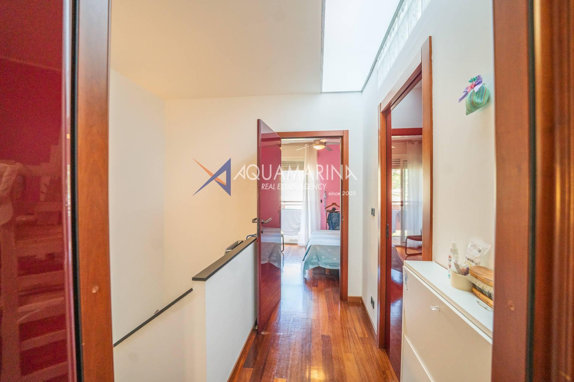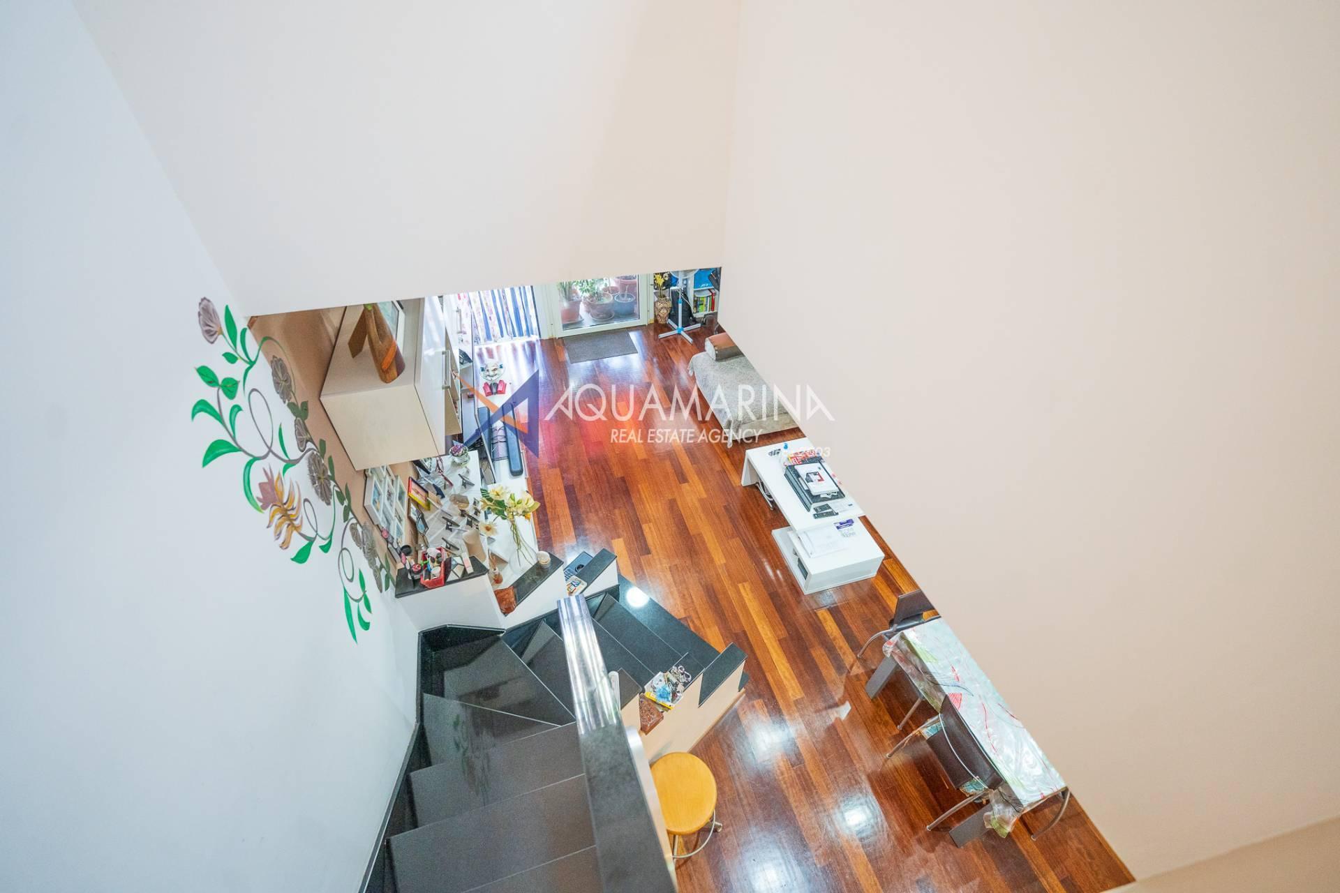 Una scenografica scala interna conduce al piano superiore, dove si trovano due camere da letto, un secondo bagno finemente rifinito e due balconi, uno dei quali con incantevole vista mare.