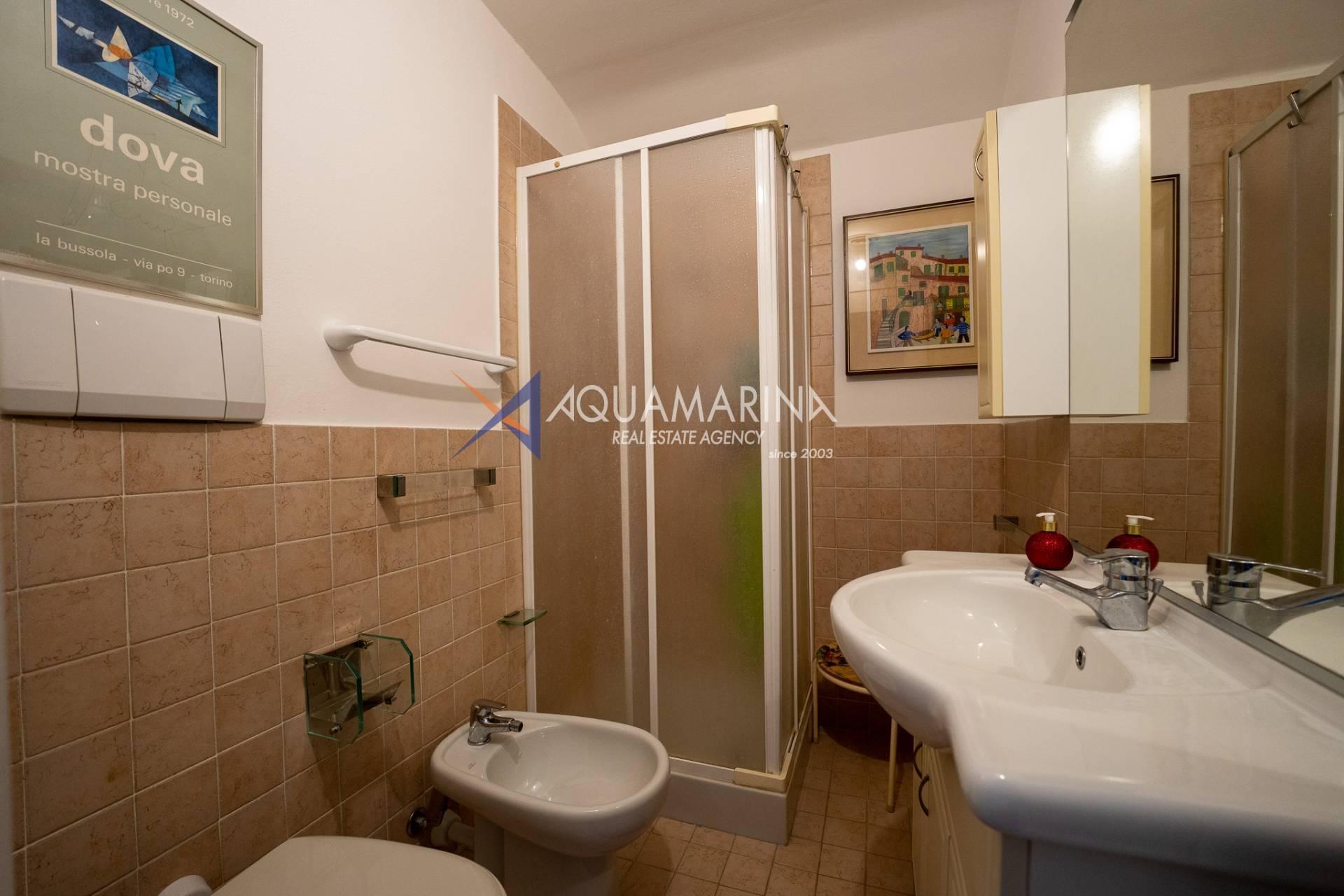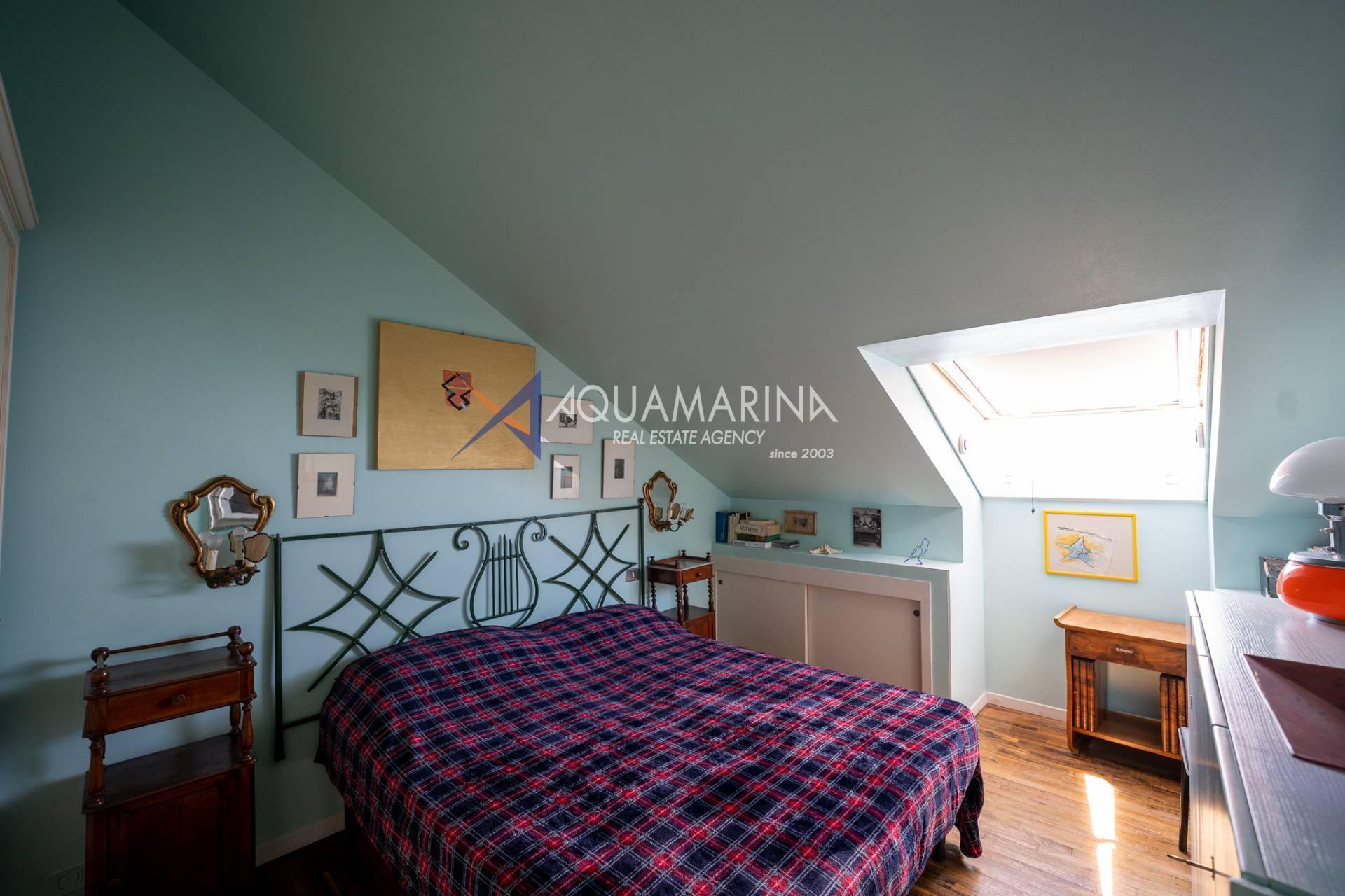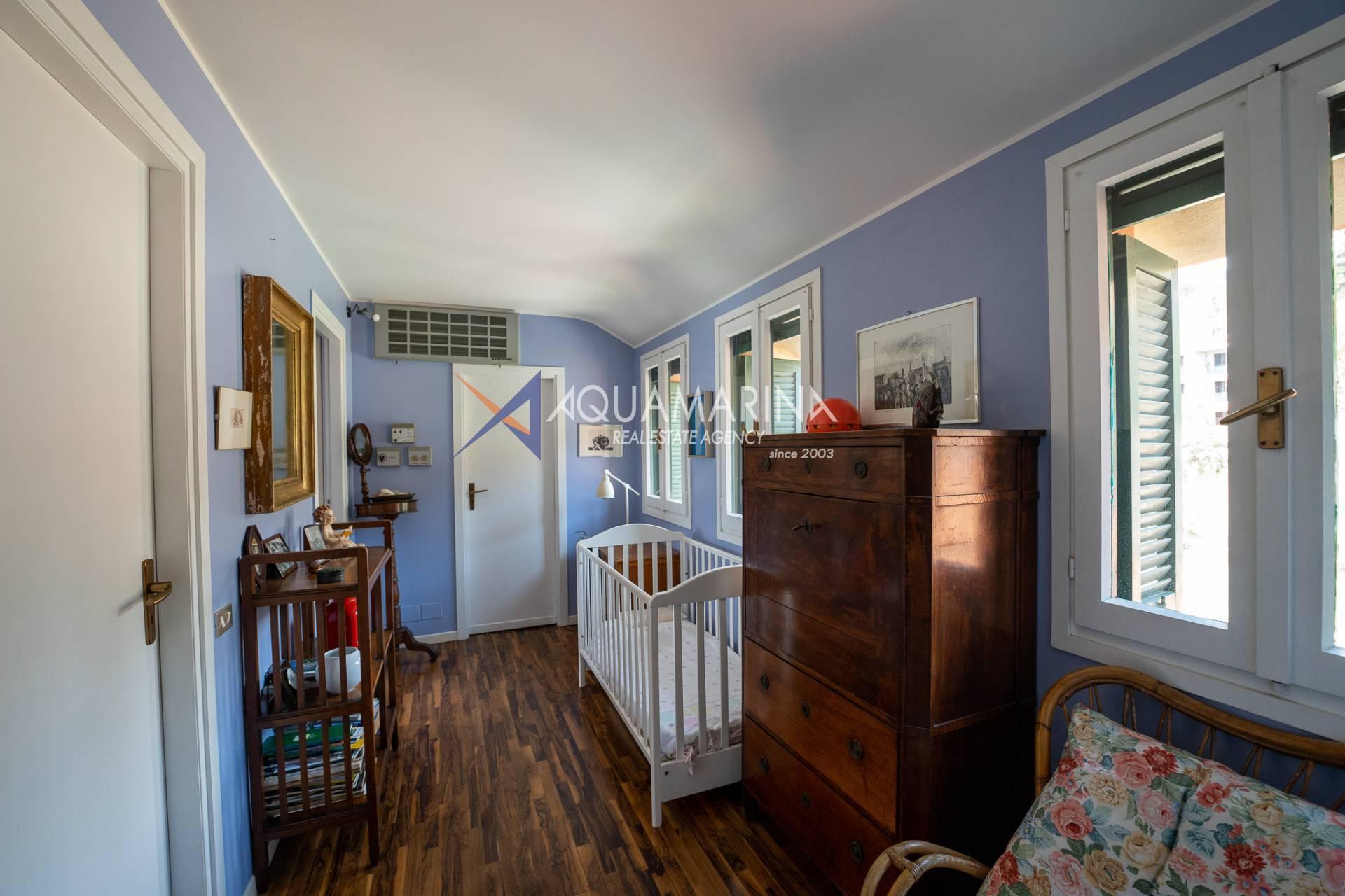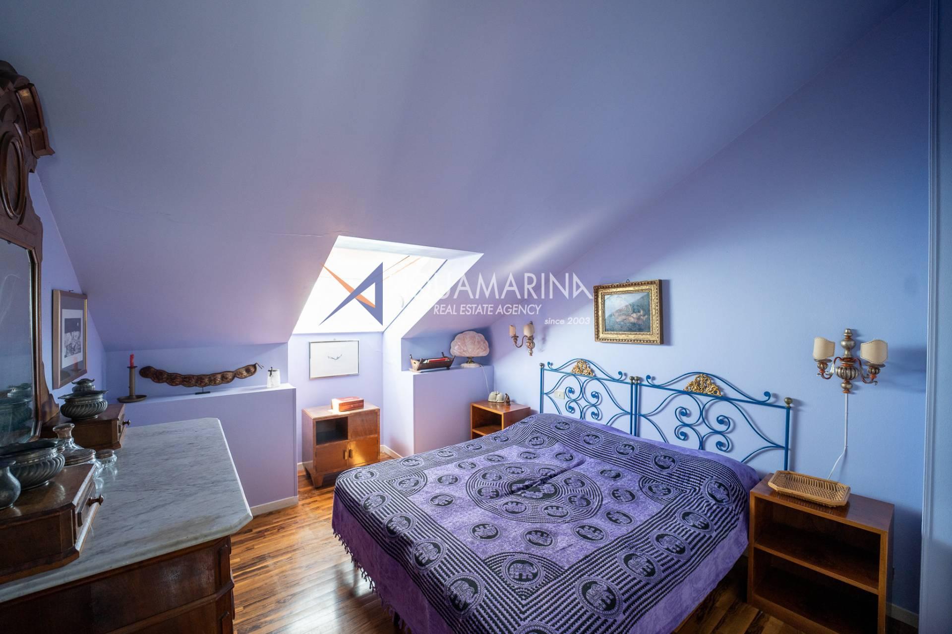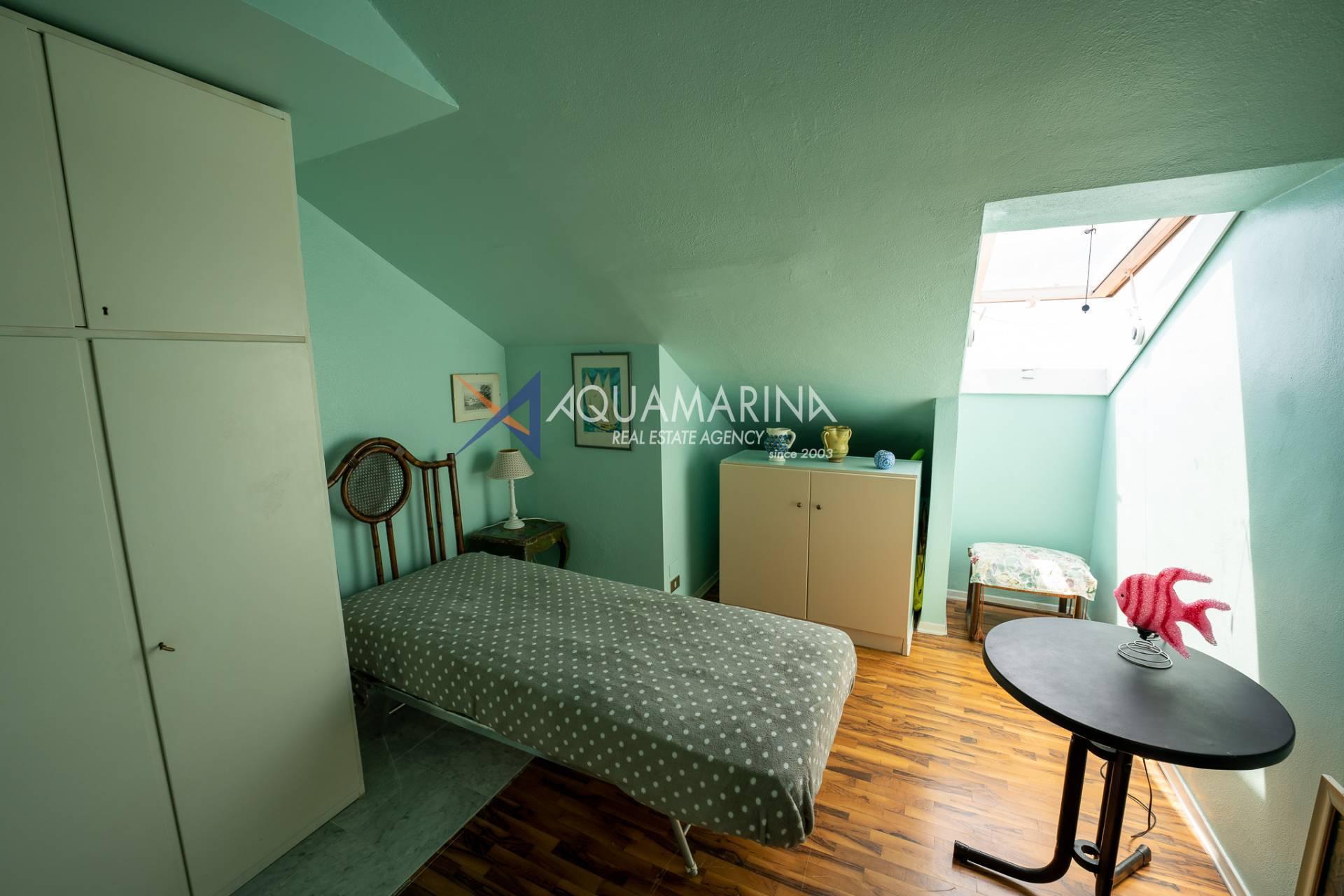 L'appartamento è composto da un ingresso diretto nello spazioso soggiorno con angolo cottura dotato di grosse vetrate esposte a sud dalle quali si gode di una splendida vista mare e sulla cittadina. Da qui tramite una comoda scale in legno si accede alla zona notte dove troviamo due camere matrimoniali, due camere singole due bagni e un servizio.
