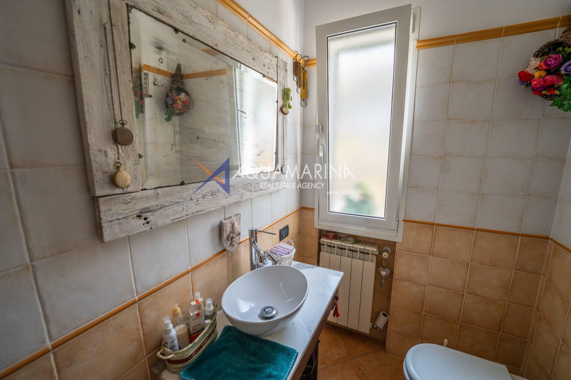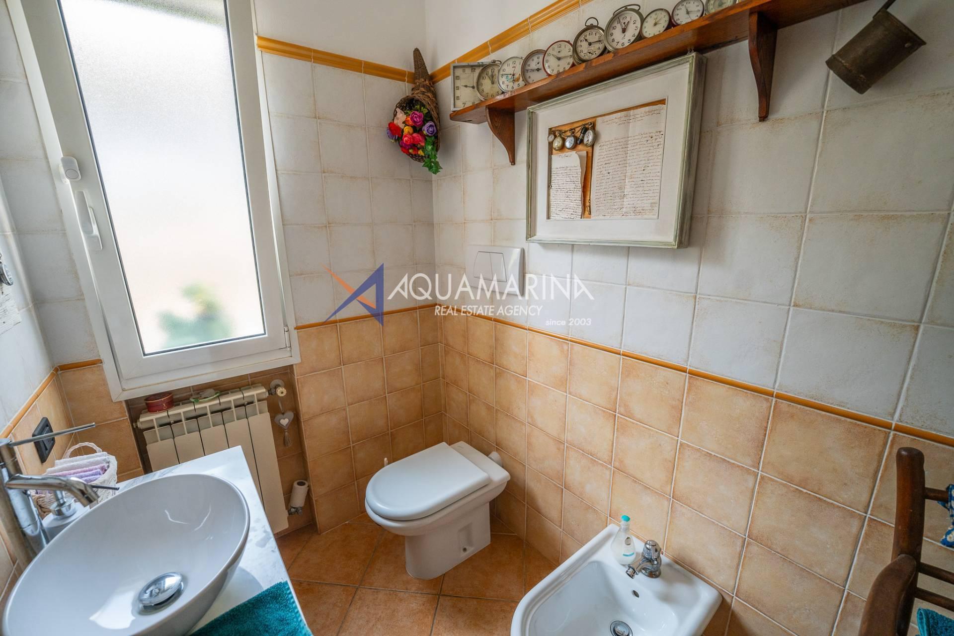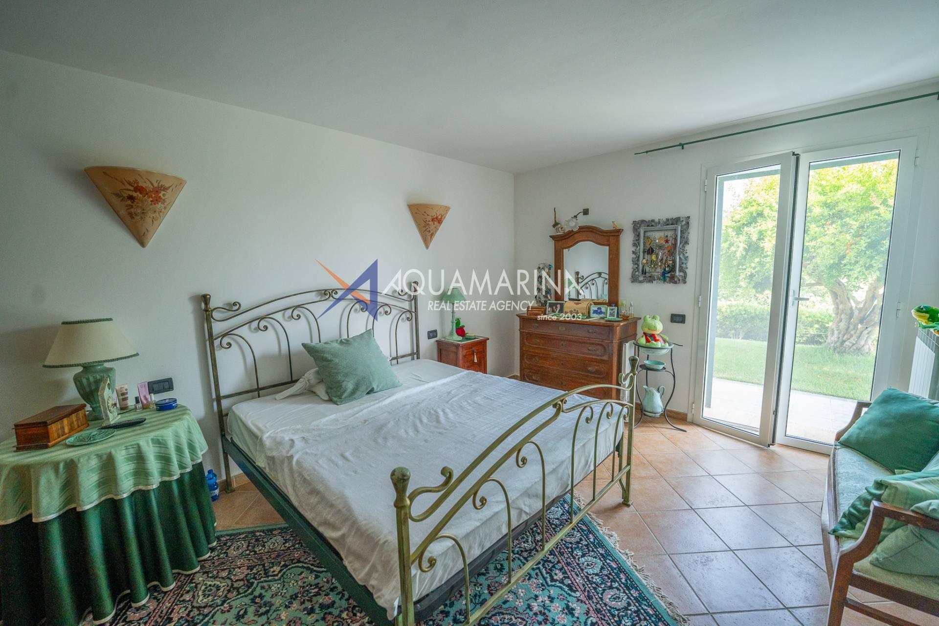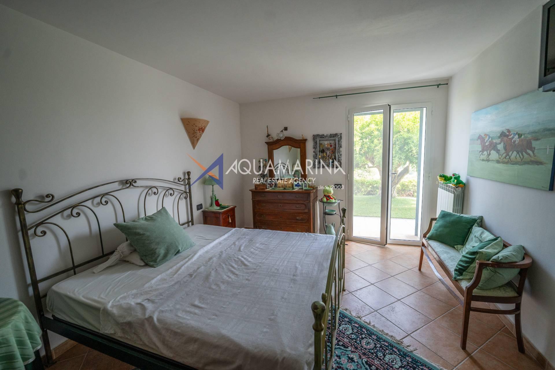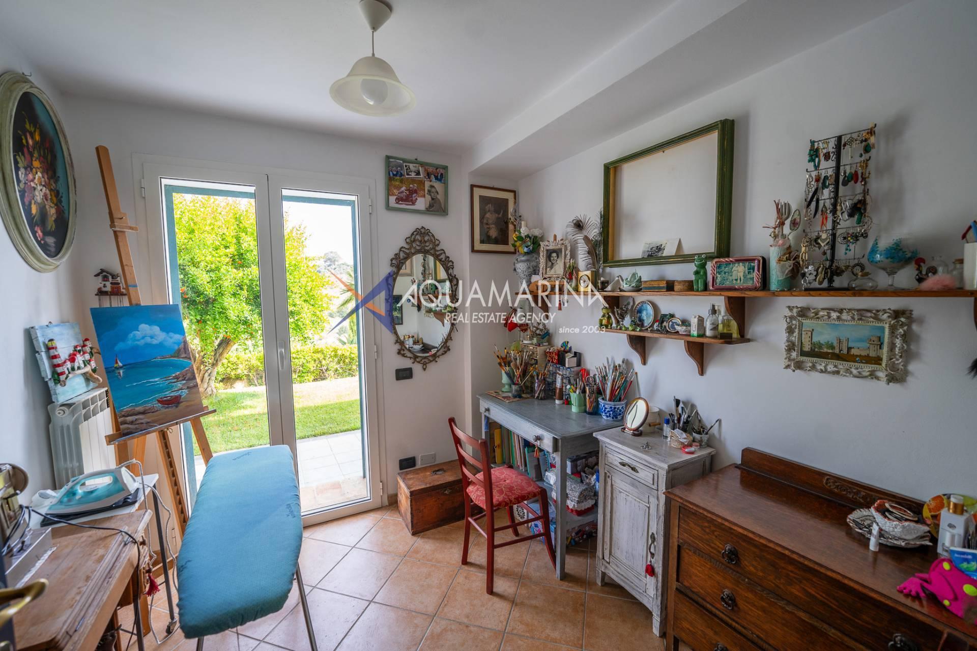 Scendendo al piano terra, lo spazio si articola in una camera/studio, una camera matrimoniale con ampia cabina armadio, una cameretta funzionale, un bagno principale completo di vasca e doccia con una splendida finestra affacciata sul mare, e infine un'ulteriore camera patronale con porta-finestra, pensata per accogliere la luce e aprirsi sul verde.