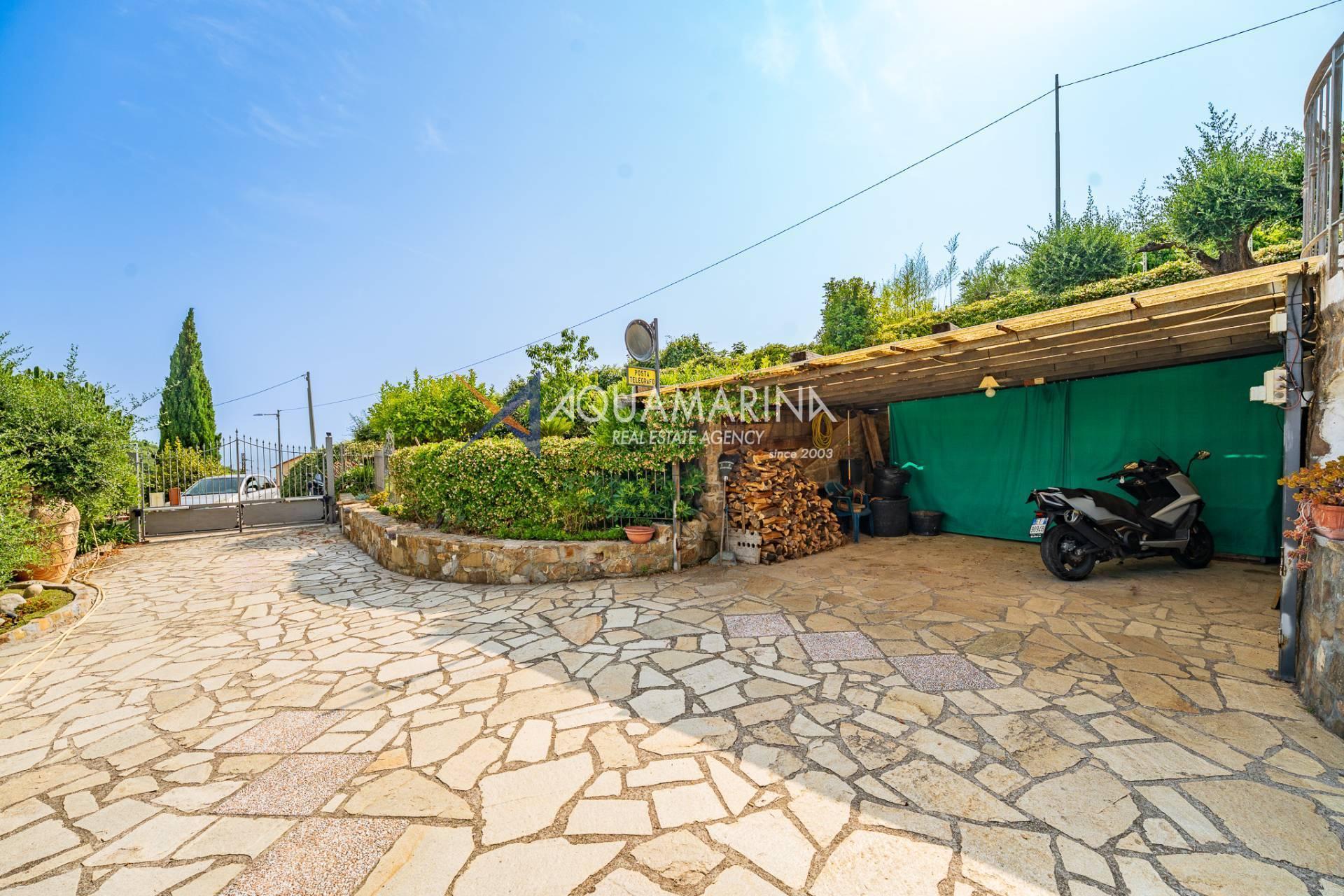 L'ingresso carrabile introduce a un'area dedicata al parcheggio, con tre posti auto di cui due coperti, perfettamente inseriti nel paesaggio.