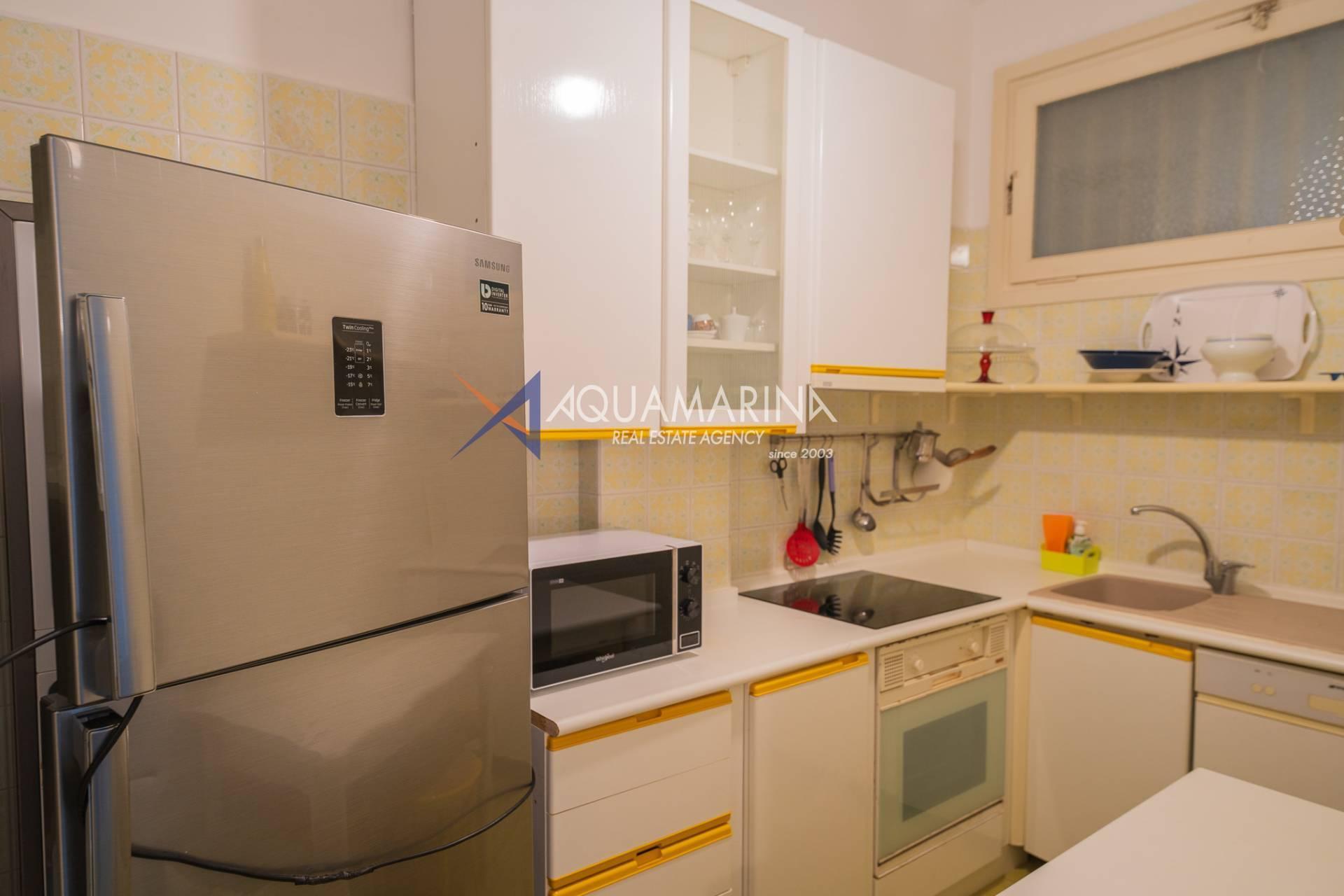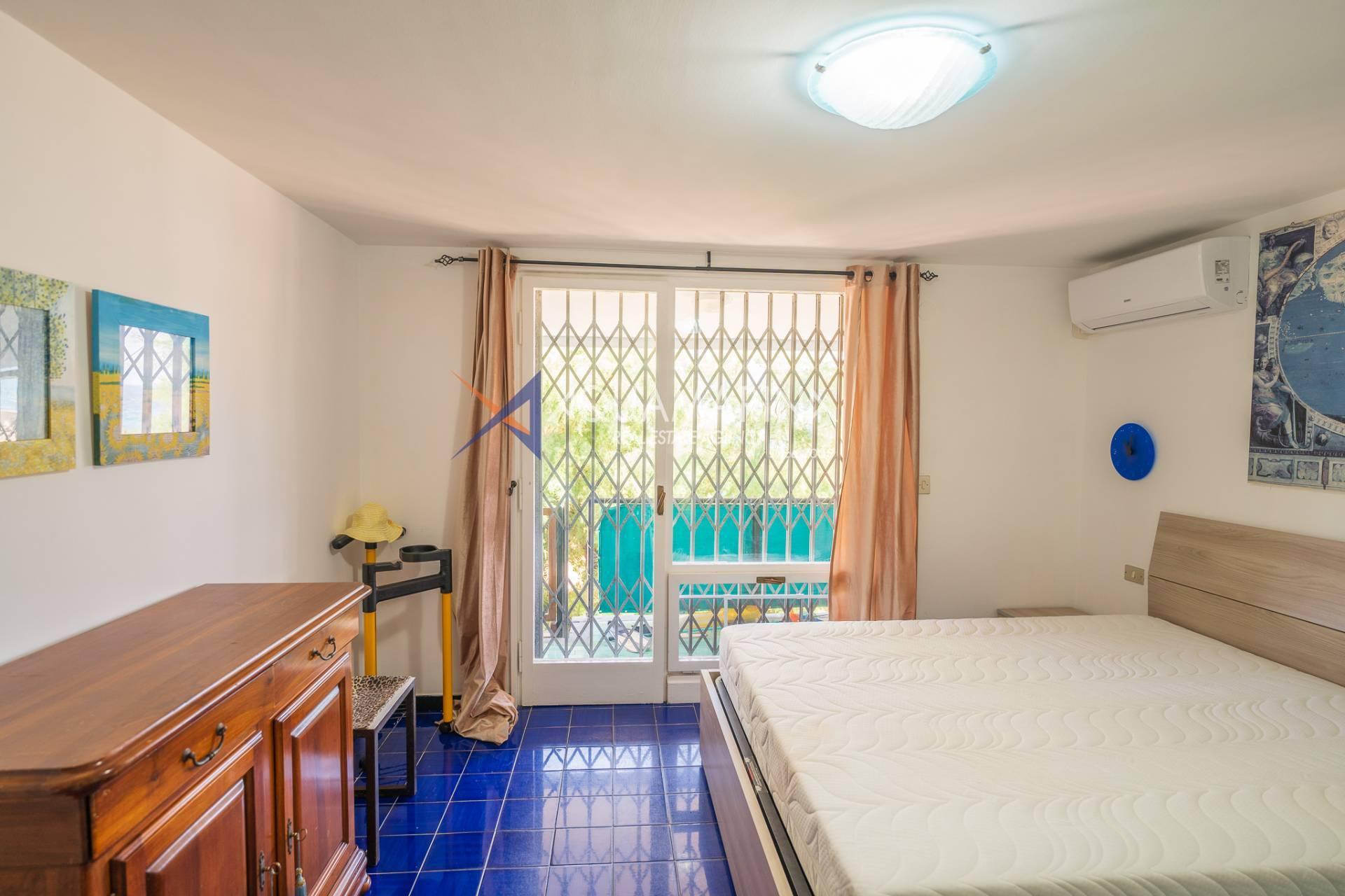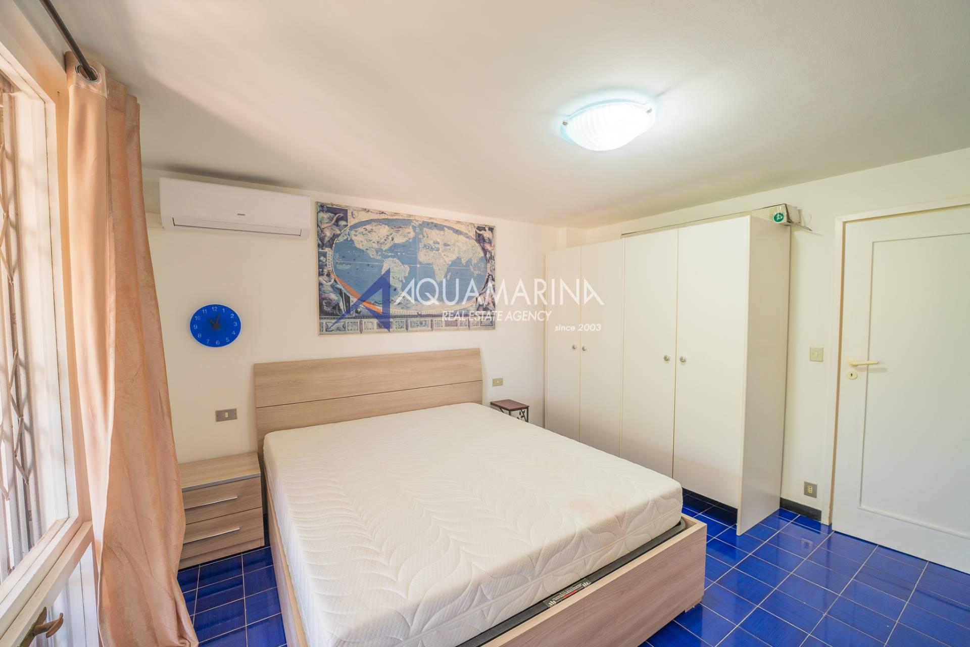 L'appartamento si sviluppa su due livelli perfettamente organizzati. Al piano superiore si trovano l'ingresso principale, una cucina funzionale, un'ampia zona giorno con spettacolare vista mare e un bagno completo. Il piano inferiore ospita una spaziosa camera matrimoniale con balcone privato e accesso diretto alla spiaggia e alle piscine condominiali, un disimpegno attrezzato con letto a castello a scomparsa e un secondo bagno.
