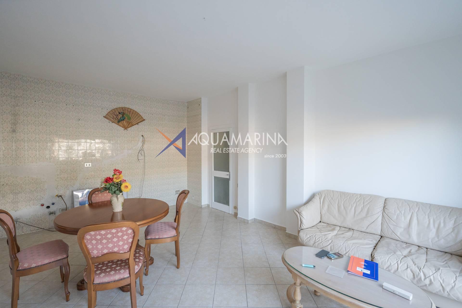 L'appartamento si apre su un comodo ingresso che conduce alla zona giorno, dove troviamo un angolo cottura ancora personalizzabile, valorizzato da una grande vetrata a tutta altezza che permette l'accesso diretto alla corte privata di proprietà. Da qui si può godere di una piacevole vista mare, che dona ulteriore charme e tranquillità all'ambiente.