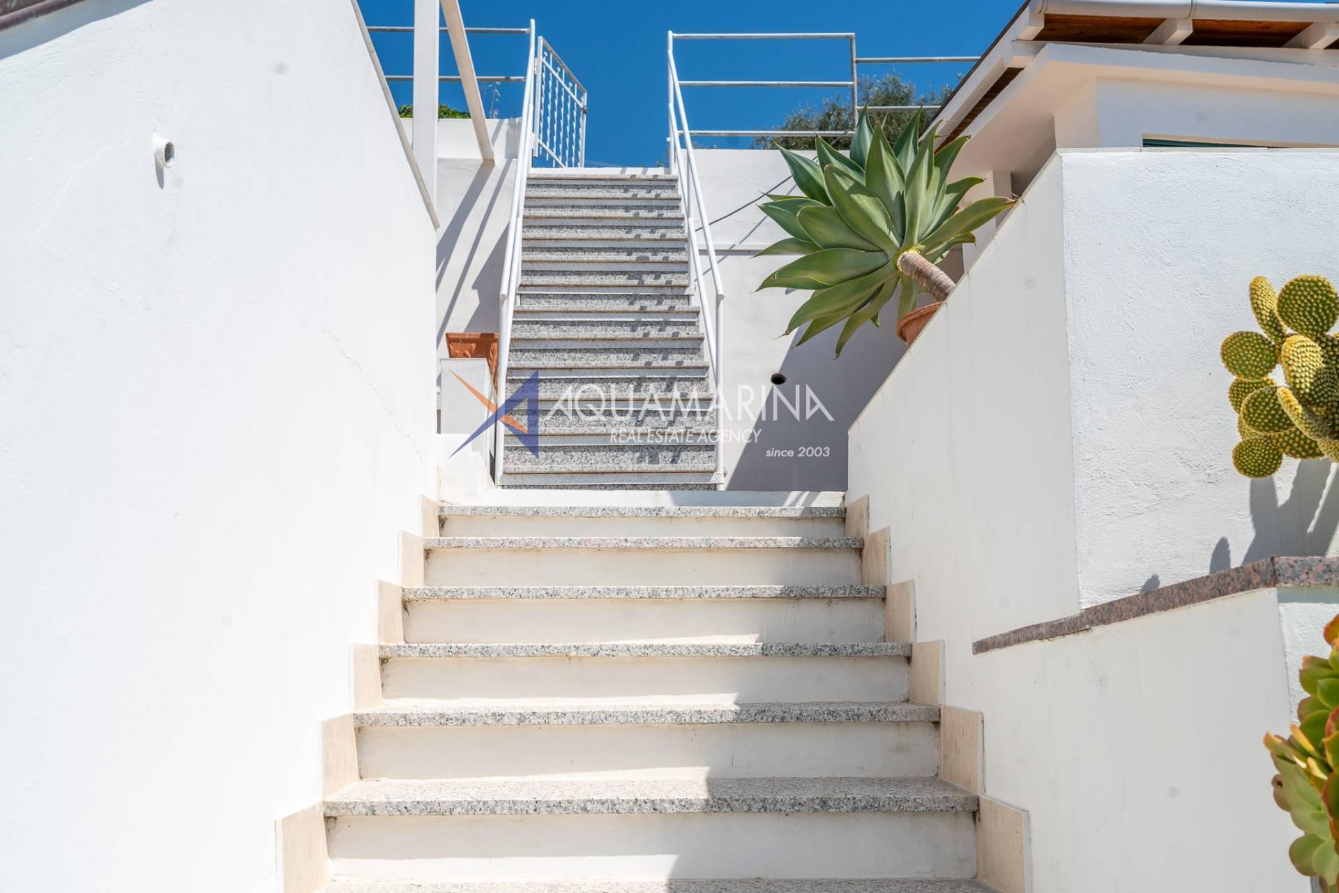 Salendo le scale esterne, troviamo un grandissimo terrazzo sempre vista mare e un giardino di proprietà di circa 500 metri.