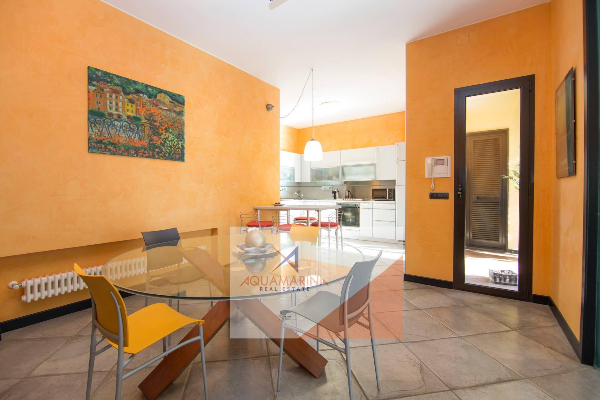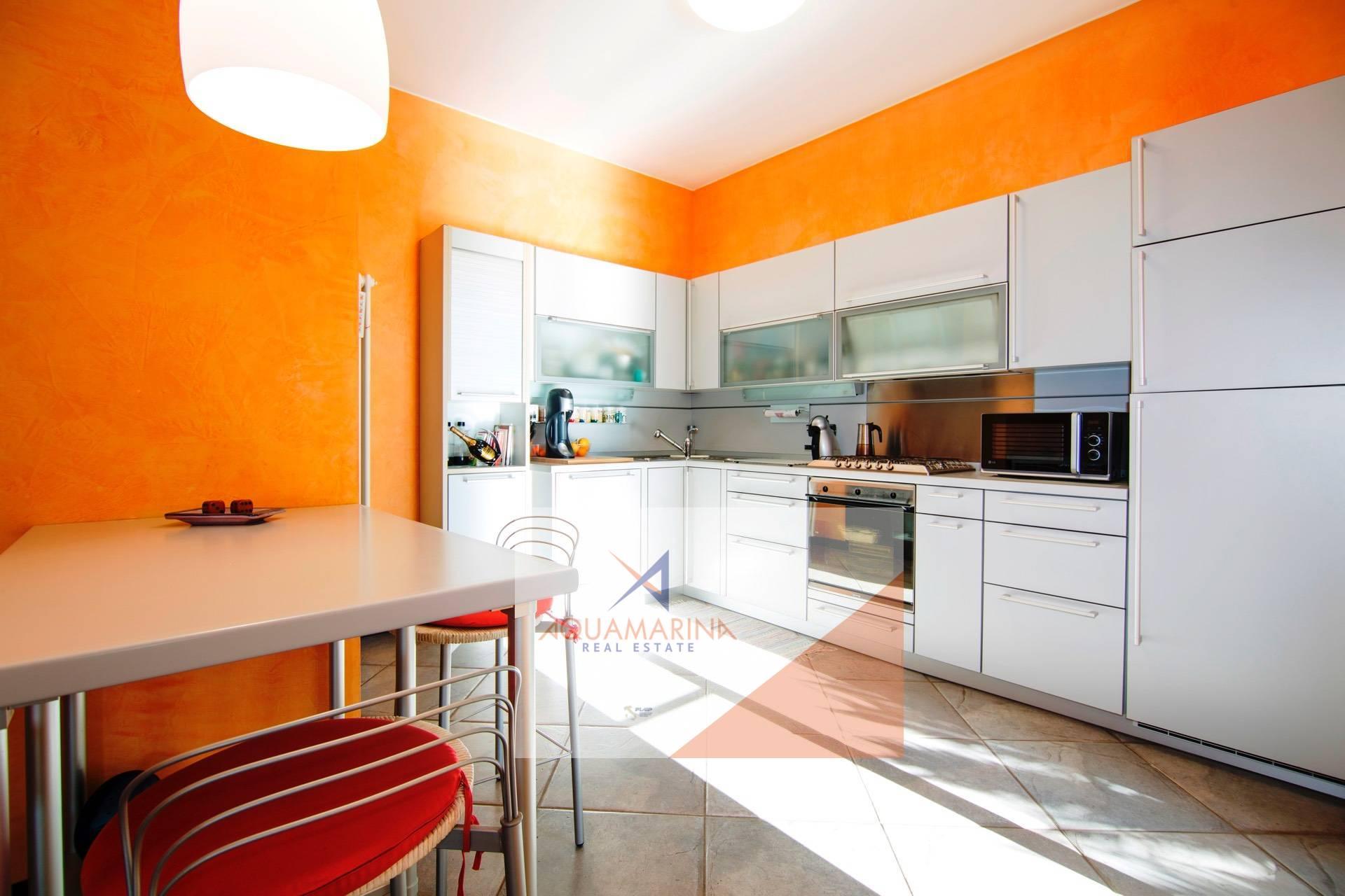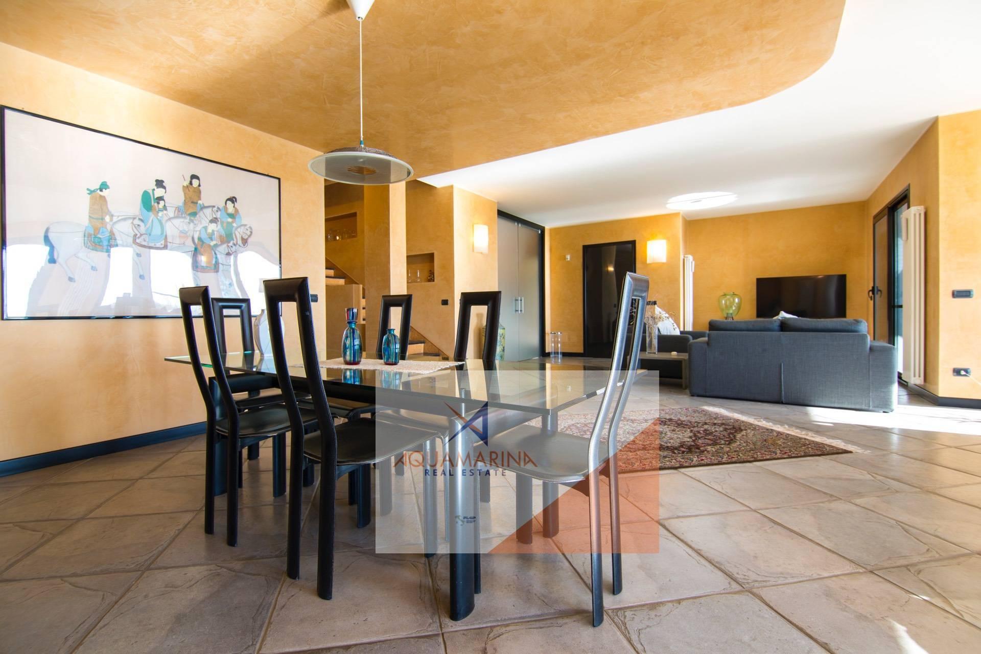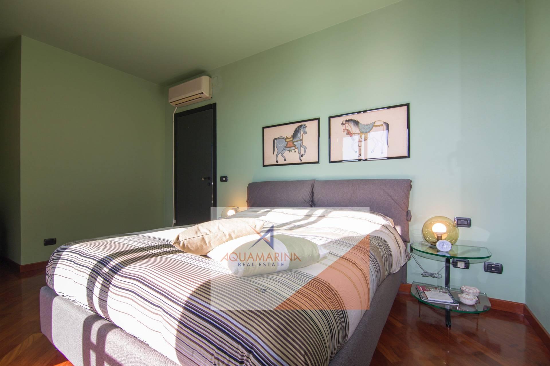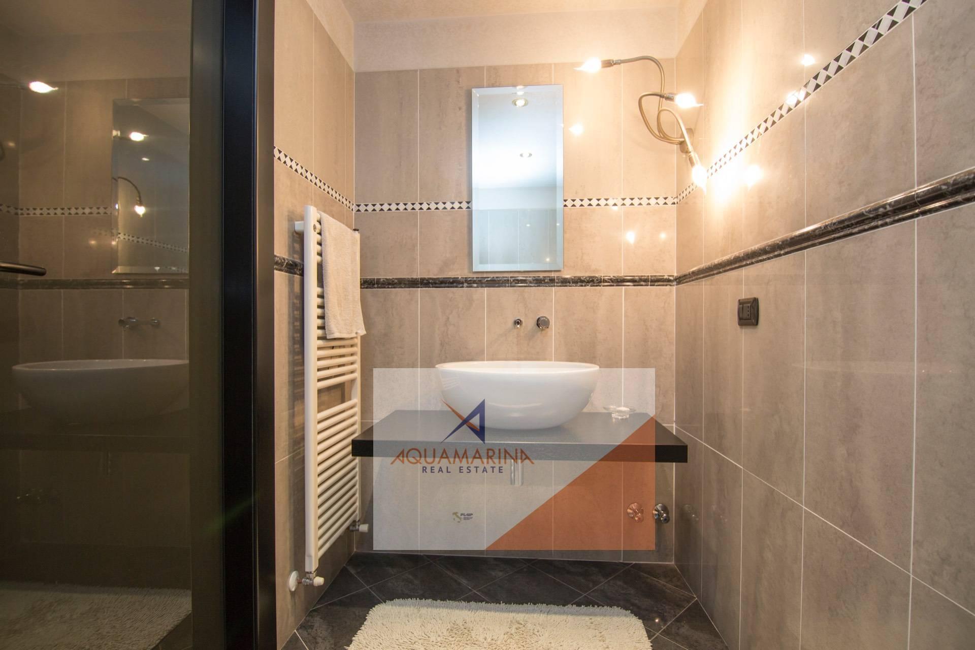Al piano superiore: zona notte con 2 camere matrimoniali ognuna con cabina armadi (eventualmente trasformabile in camera da letto), doppi servizi, terrazza e porticato con fantastica vista mare. Il porticato può essere trasformato in abitazione, avendo così altre 2 camere da letto con bagno.