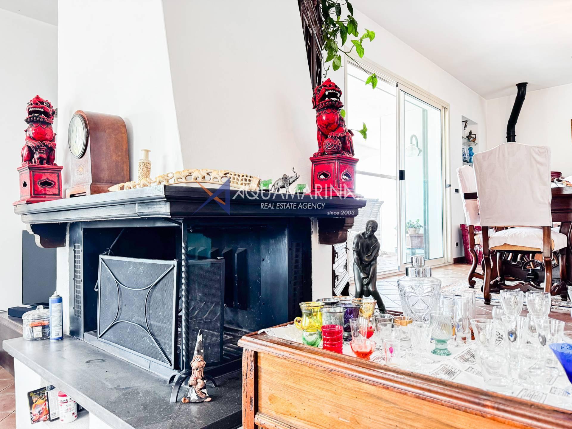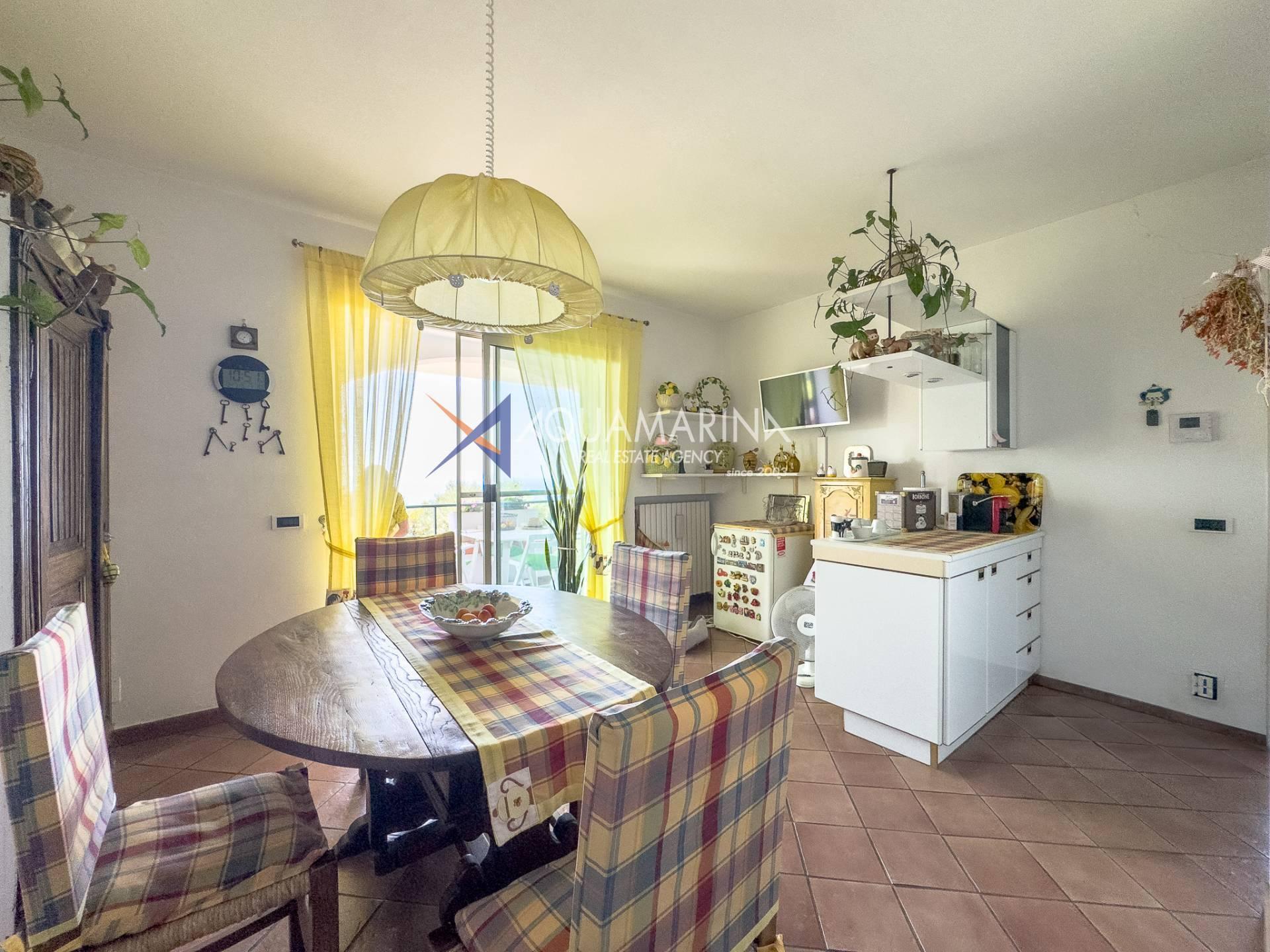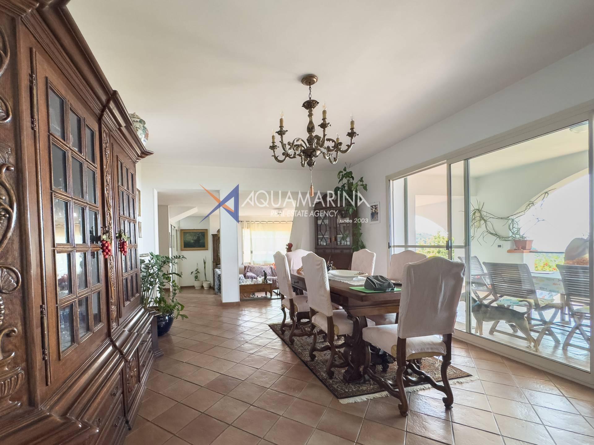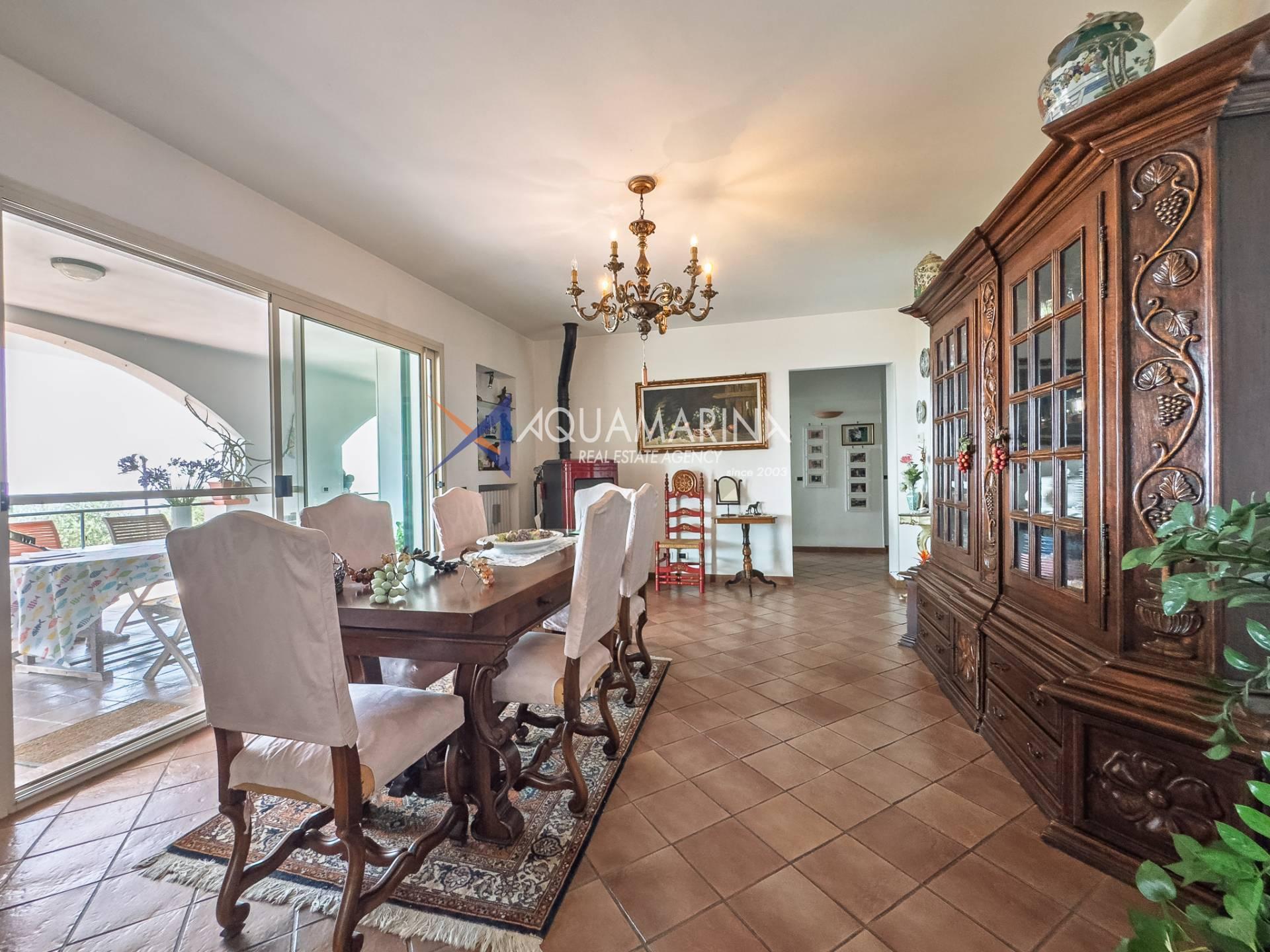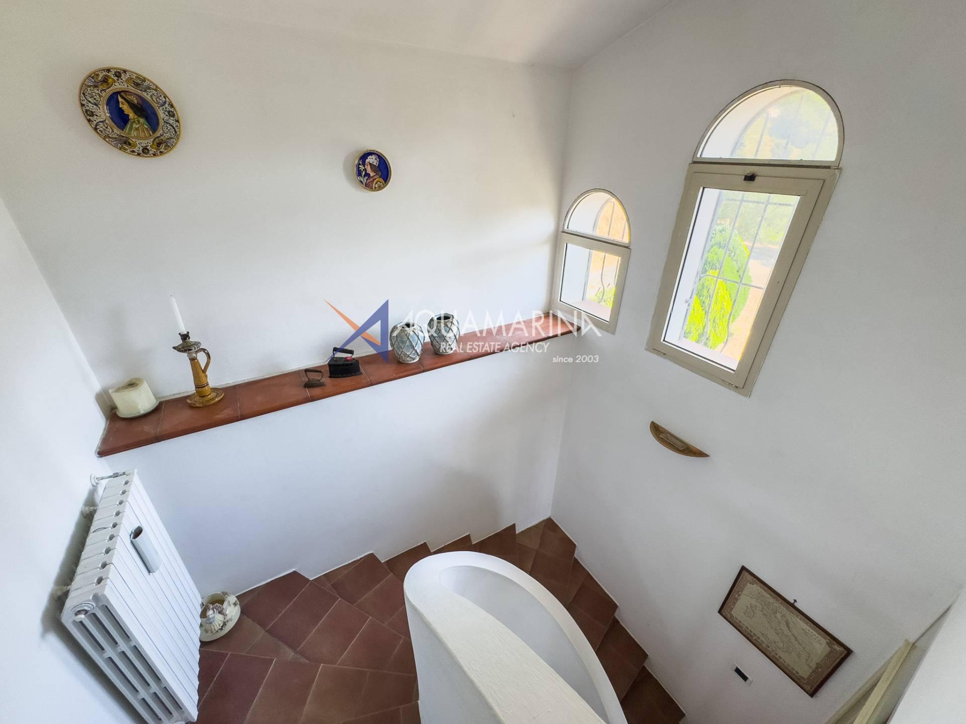 - Primo piano è la zona dell'abitazione principale della casa, dove si trova ingresso, soggiorno, sala da pranzo, cucina, due camere da letto e due bagni, un'ampia terrazza coperta lungo tutto il perimetro sud della casa, una magnifica vista panoramica sul mare e sulle colline circostante, una scala interna che conduce al piano superiore il sottotetto, attualmente non utilizzato;
