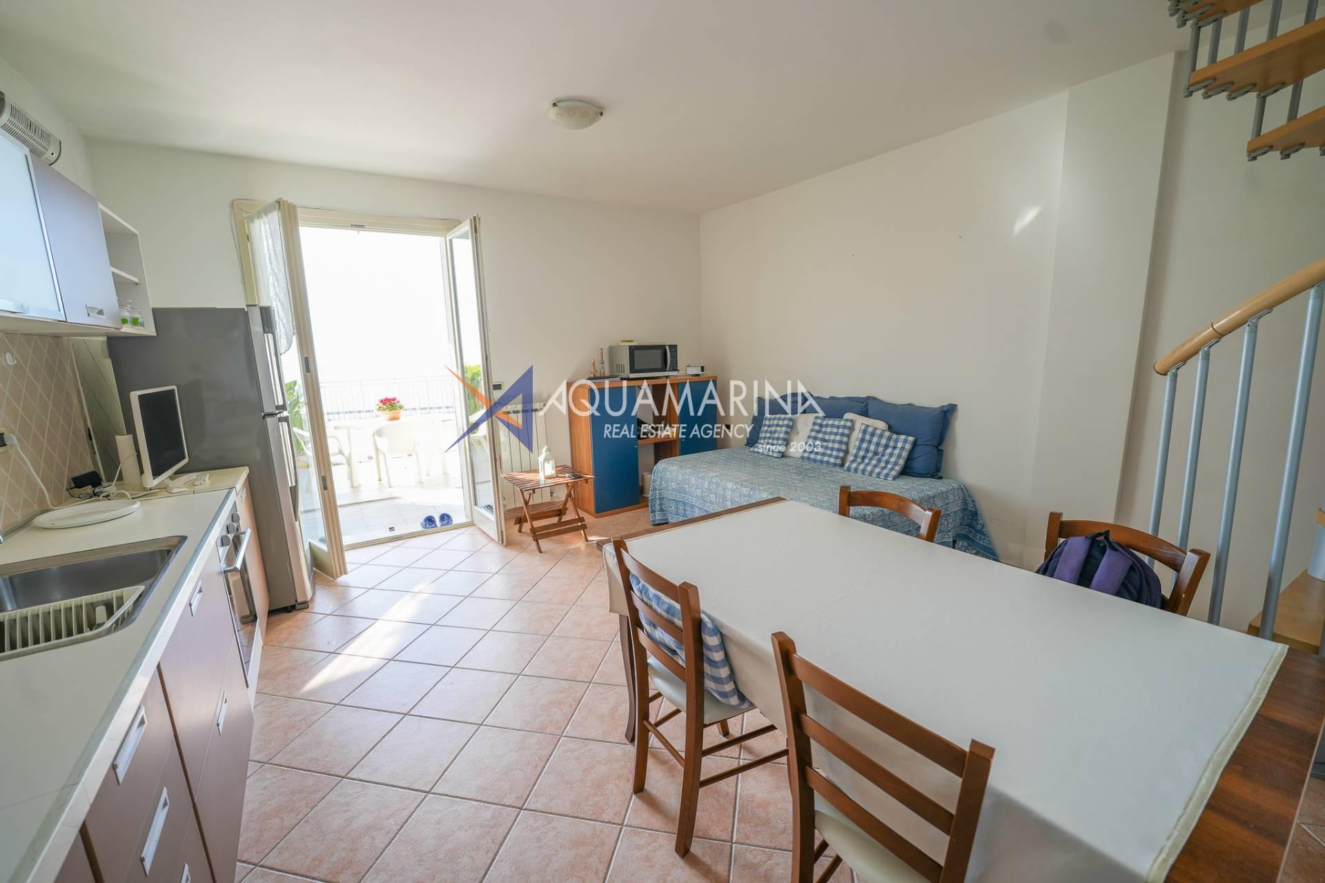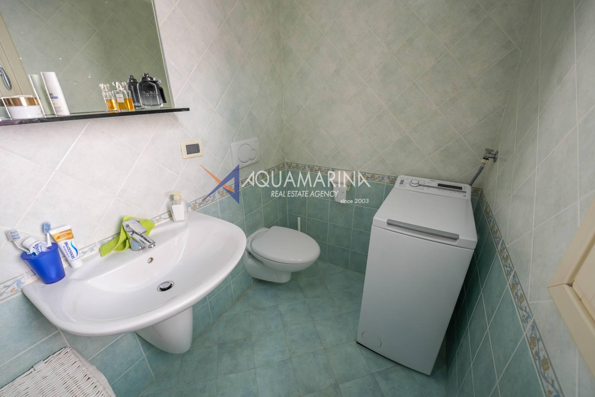 L'appartamento ha ingresso indipendente su ampia zona giorno living con cucina a vista, con accesso diretto al magnifico giardino privato che regala una vista mare da sogno.