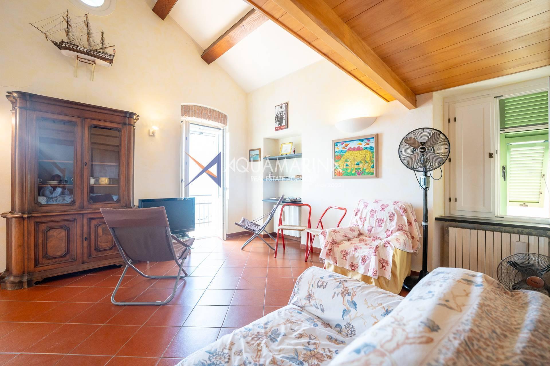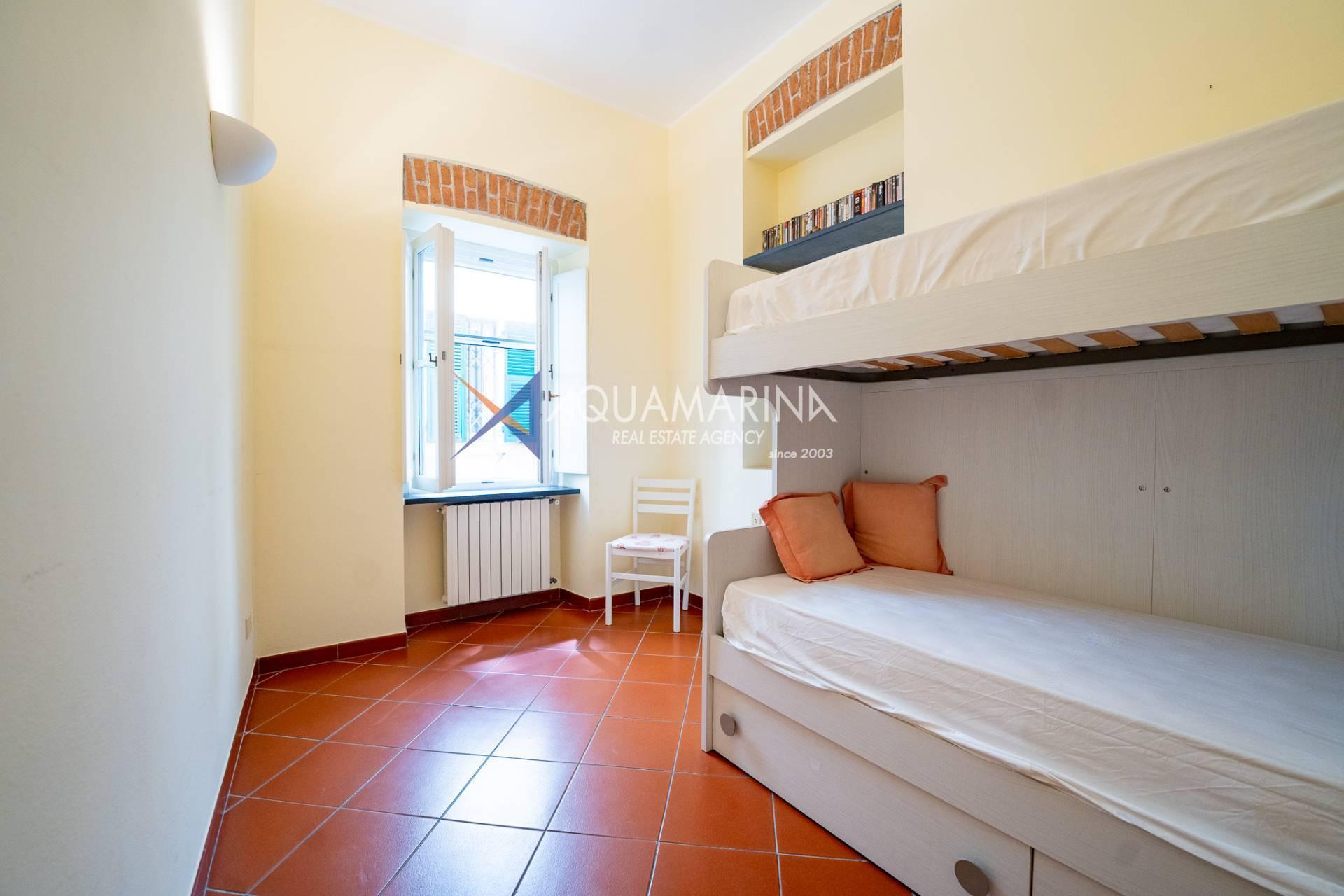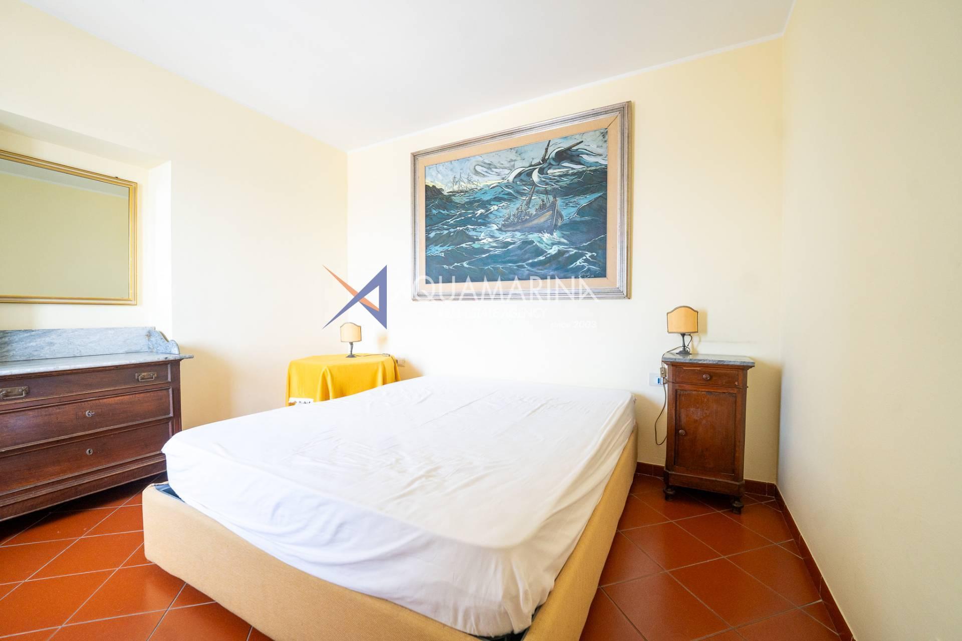 L' accesso alla propietà è costituito da una comoda scalinata esterna in stile ligure davanti al mare, che porta al primo piano composto da ingresso, 3 stanze da letto finemente arredate e il bagno spazioso e dotato di tutti i confort.